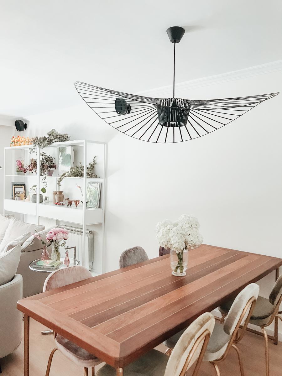 En el comedor reina una luz increíble con vistas a la montaña y a un jardín donde Ana también realiza sus clases de decoración floral. En esta estancia, el elemento por excelencia y la que se lleva todas las miradas y elogios en la gran lampara de diseño. Ya os he dicho que esta pareja es de lo más apañada, así que las mesas y las bases de los muebles las hicieron ellos mismos con la teca reciclada del antiguo jardín.