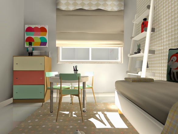 El proyecto deco se ha realizado en una habitación real, de tamaño pequeñito. Como dispone de armario empotrado no me he preocupado de poner demasiados muebles de guardar y es además de una habitación para dormir un cuarto de juegos y de primero estudios.
