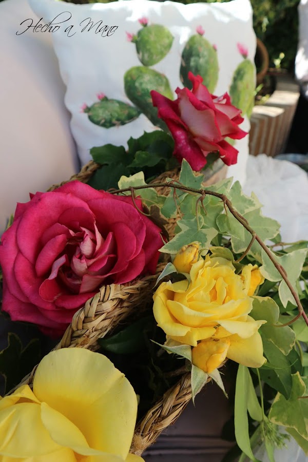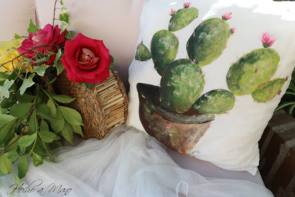 Te dejo con unas cestitas que me he fabricado con salvamanteles, goma Eva y palitos de cañizo. Son para colgar en la paed, pero te las muestro así. También con mi cojín de cactus, que me ha dado tiempo a terminar por los pelos. Otros dos con coronas para alguien que aprecio mucho se han quedado a la mitad. Como siempre pintado a mano alzada y con pintura para tela. Pensaba hacer una colección para el jardín que, tendrá que esperar, al igual que los de las coronitas.....