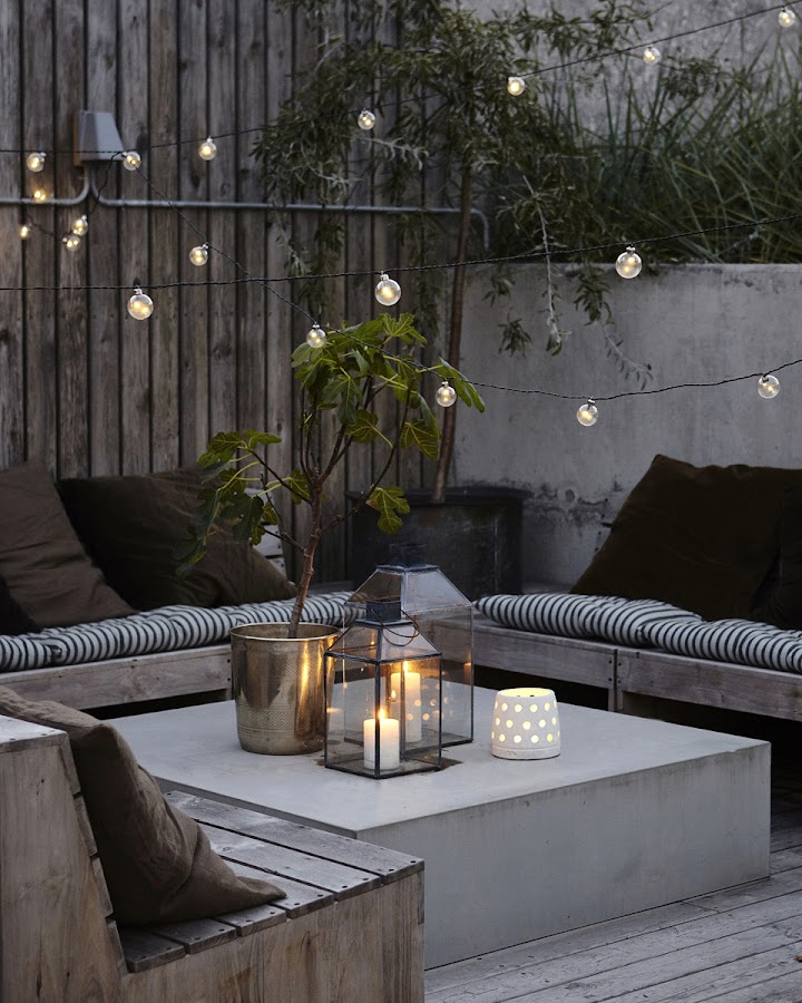 ¿Tenéis guardadas las guirnaldas de luces navideñas? ¿Porque no usarlas ahora en la terraza? Dentro de un bote de cristal como centro de mesa, vistiendo un arbusto, o usándolo para hacer una guirnalda DIY usando pequeños cubos de papiroflexia, bolas de ping pong, los botecitos usados del café... ¡Imaginación al poder!