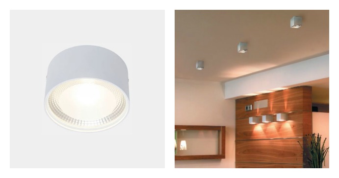 Al final, después de explicarle al electricista cientos de veces por qué no quería los downlights que él siempre coloca en la cocina, nos decidimos por unos focos empotrables de superficie, como los de la foto de la izquierda. Ahora cada vez que las miro, me alegro de haber tomado esa decisión.