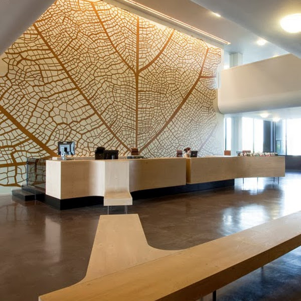 PHOTOS VIA DEZEENHall de un edificio en la ciudad belga de Hasselt diseñado por el estudio  J. Mayer H. Architects que alberga, el palacio de justicia, librerías y auditorios. Sin duda esta ha sido la estancia que más nos ha gustado por su impresionante manera de inspirarse en la naturaleza ampliando hasta el extremo una hoja y creando un mobiliario basado en la línea orgánica.