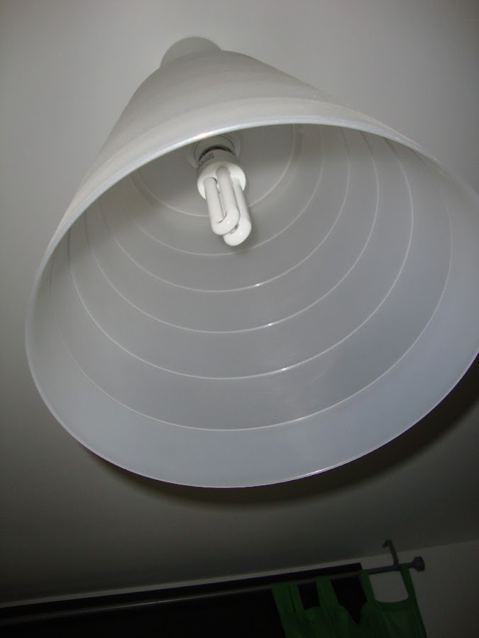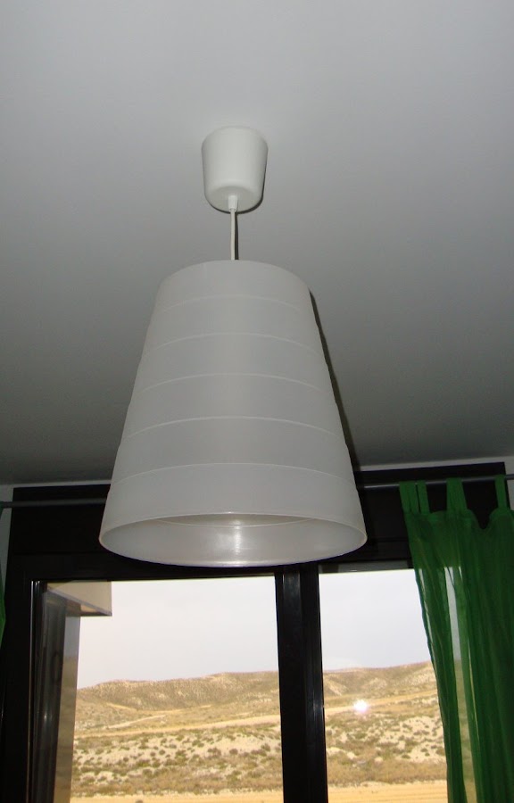 A una papelera Fniss le he hecho un agujero para introducirle la montura para lámpara de techo Hemma. El agujero se puede hacer con un cúter, calentando previamente la zona para que el plástico no se raje. Si tenemos una broca de corona, el trabajo se facilita.