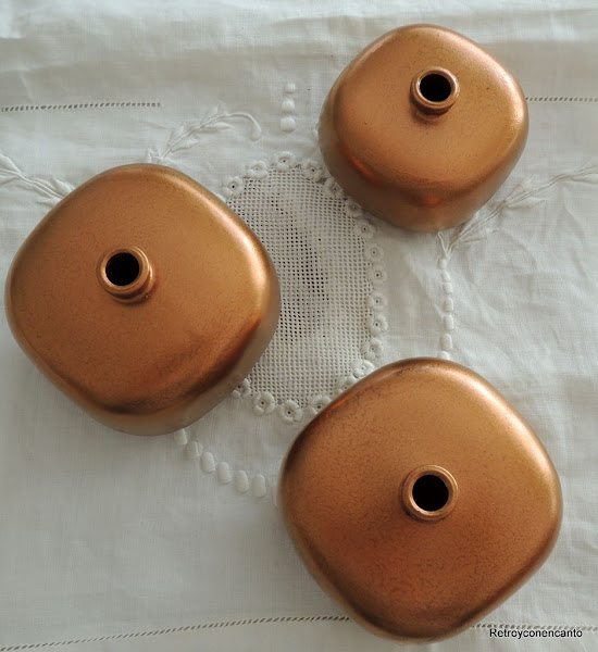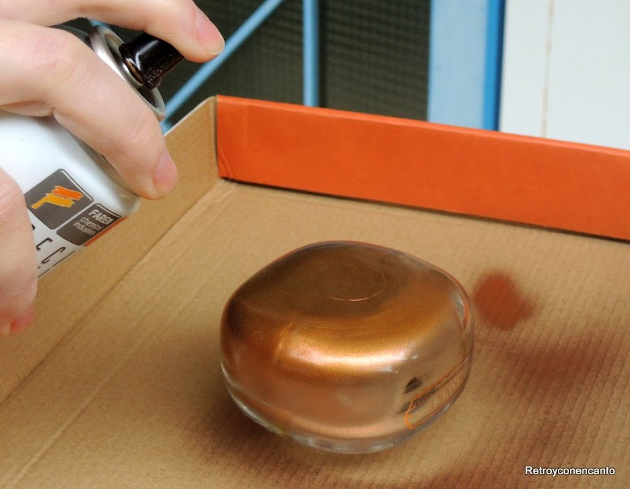 Con pintura en spray bronce le dimos un toque de color a los tres botes de cristal,