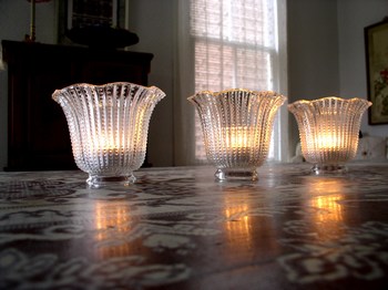 Cuando decidimos comenzar con el blog y montar el taller, hicimos las dos un viaje express a Portugal, en concreto a un pueblo llamado Santarém. En él vivía Cruz, una buena amiga que nos enseñó varios anticuarios y naves donde se vendían muebles de segunda mano. Y es en una de estas naves, inmensa ella, donde adquirimos la mayoría de nuestras primeras piezas vintage, y una caja llena de unos preciosos y delicados objetos que descubrimos al final del recorrido. El sitio era enorme y lleno a rebosar, pero la adrenalina y los nervios por no dejar nada sin investigar, nos llevó hasta la planta alta, a una especie de buhardilla donde no se veía ni tres en un burro, a pesar de que la única bombilla existente estaba prendida. Cuando nuestros ojos se acostumbraron, descubrimos que las estanterías estaban llenas de tulipas, muchas tulipas de cristal cubiertas de polvo. Era dificilísimo distinguirlas, así que echamos mano de nuestras sendas Blackberrys, que por aquel entonces no tenían linternas y, dándole una y otra vez al botoncito que encendía la pantalla fuimos eligiendo y descartando. Allí nos habríamos quedado horas, ¡era el reino de las pantallas vintage! pero nos estábamos quedando ciegas y sólo contábamos con un coche, el nuestro, para trasportar nuestros tesoros de vuelta a casa. Os enseñamos la foto del bodegón que preparamos para unas Navidades con muchos de aquellos fanales.