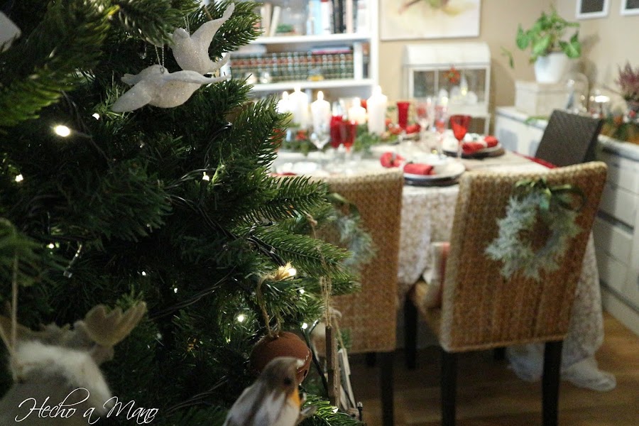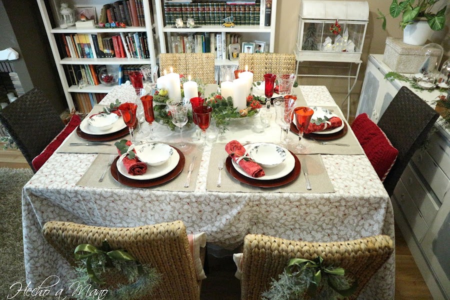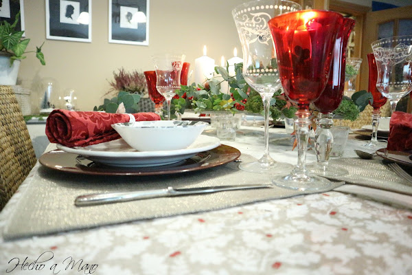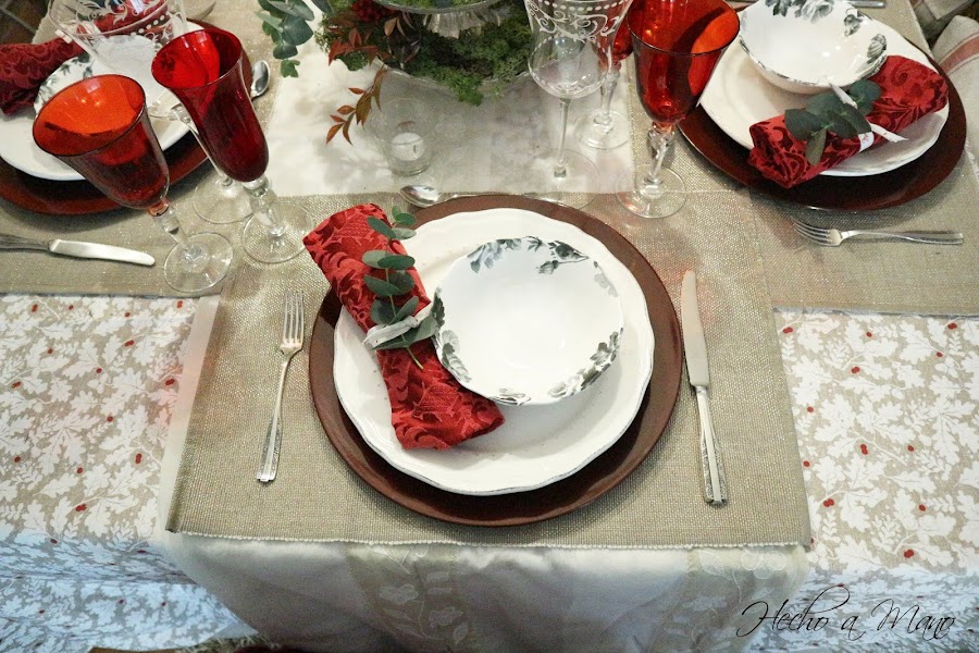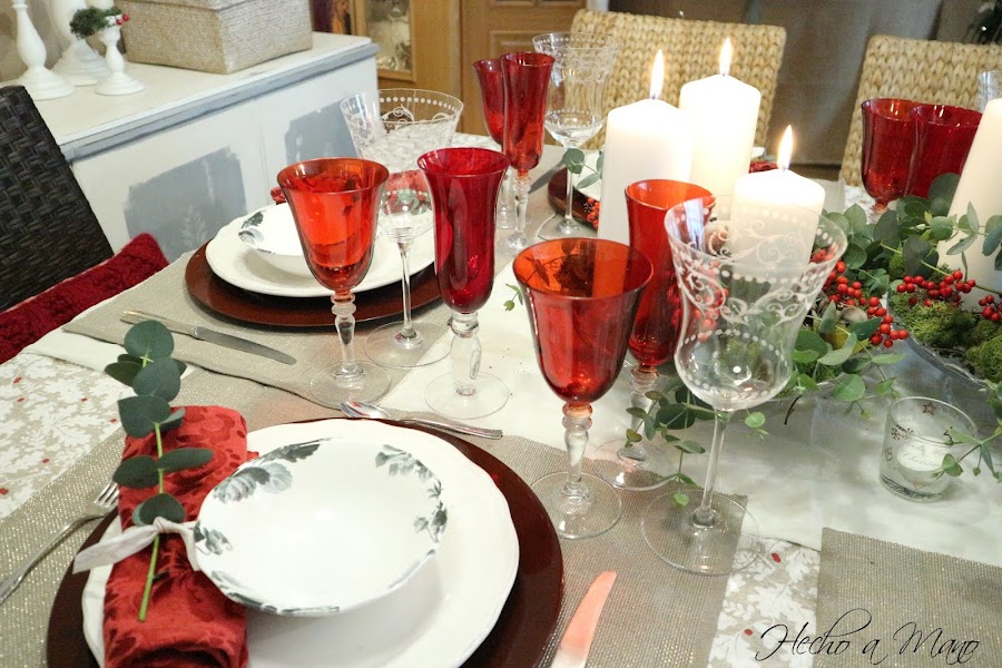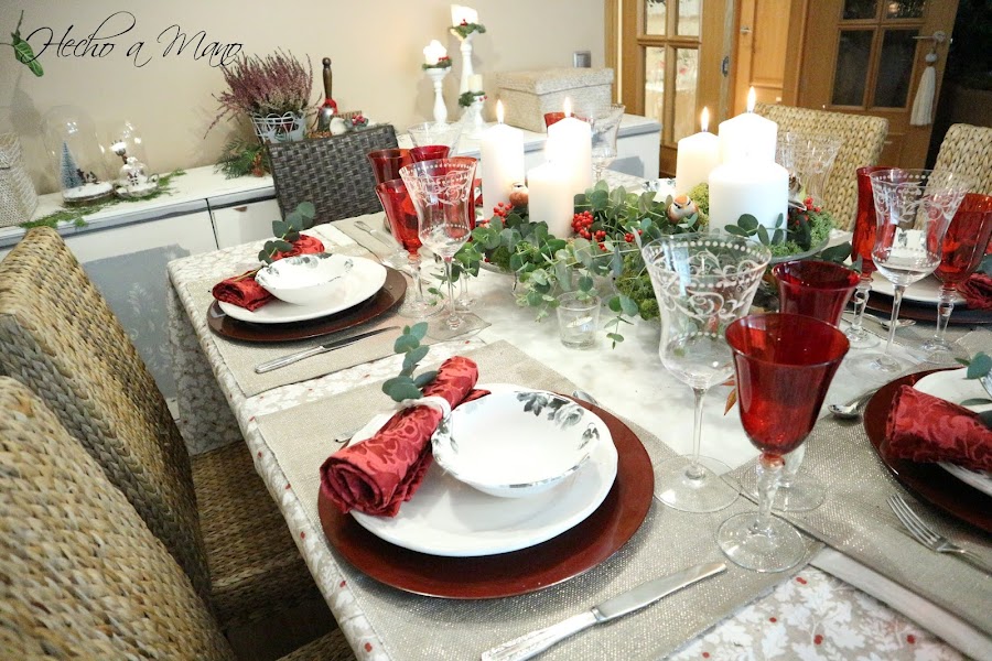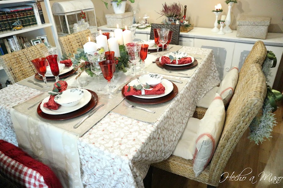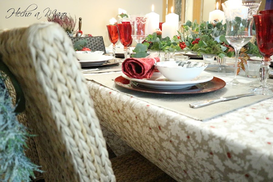 Un discreto mantel en tonos blanco y beige y con alguna que otra bayita roja muy, muy discreta es la inspiración para toda la composición.
