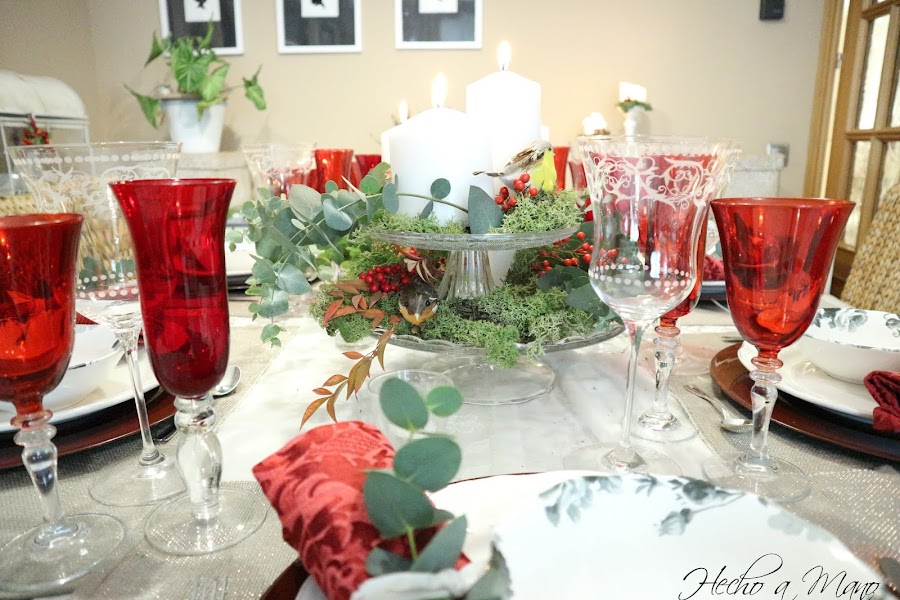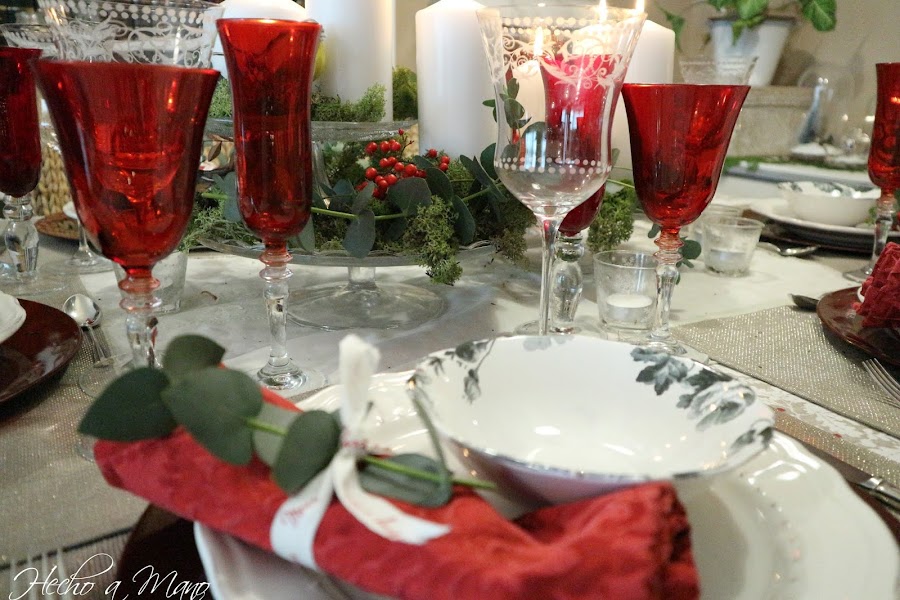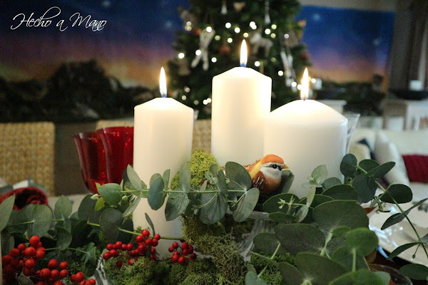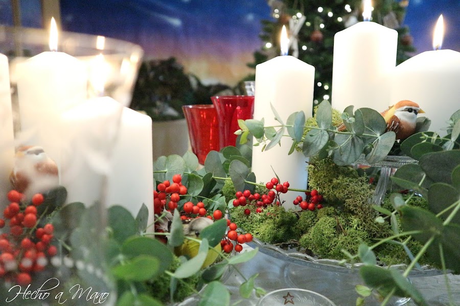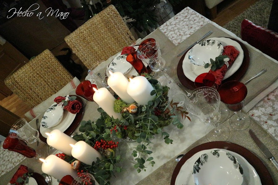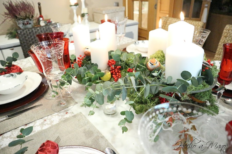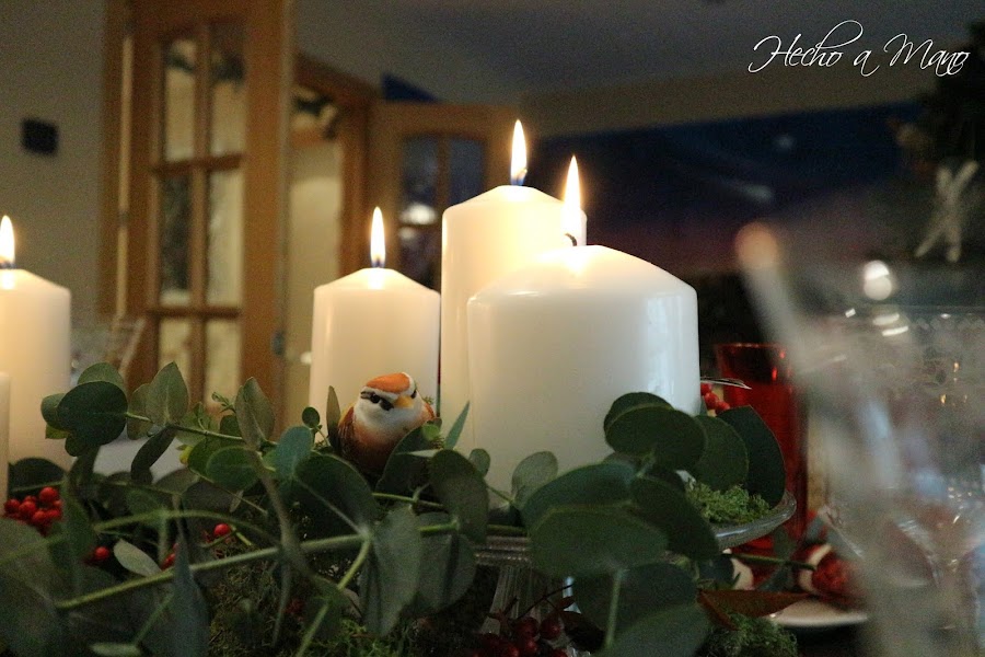 La decoración central de la mesa es a dos alturas y consta de liquen, eucalipto, bayas y alguno de mis pajarillos. Todo ello natural, menos éstos últimos. Por supuesto velas, muchas velas.