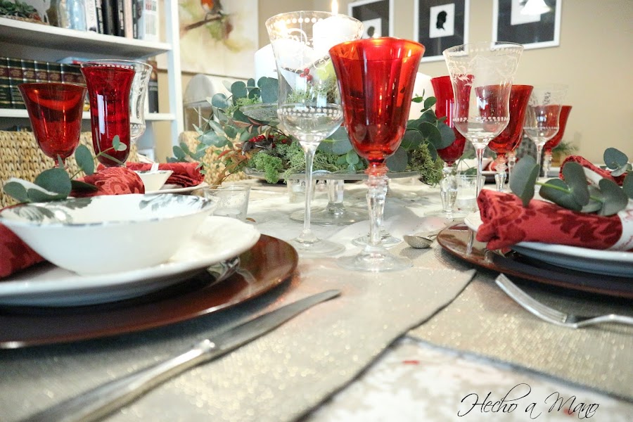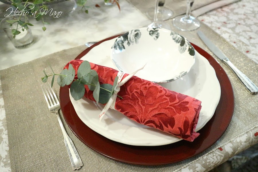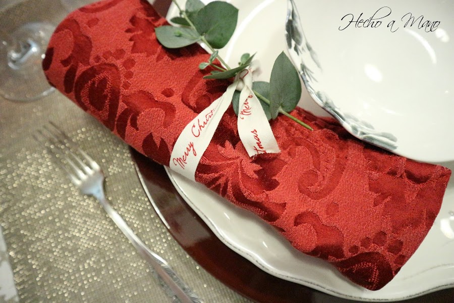 Deseos de una Navidad feliz pueden leerse en la cinta que rodea a la servilleta que es de color rojo inglés, junto a una rama de eucalipto.
