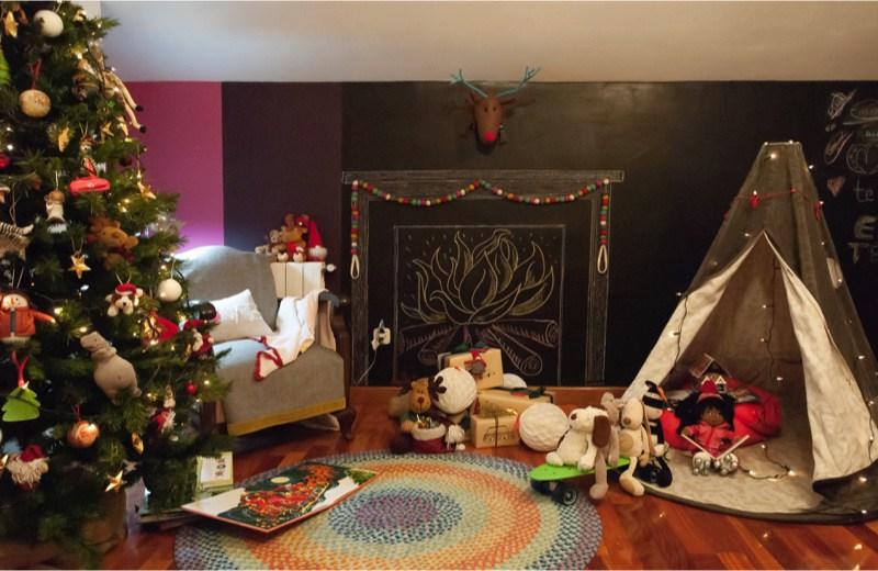Aquí es donde se ha venido el árbol este año. Los niños son los que más disfrutan de la Navidad, así que ¿por qué no dejar que ellos también decoren el espacio donde pasan más tiempo? Ha quedado tan hogareño que los regalos de Santa y Reyes acabarán delante de esta chimenea de tiza (los que ves en la foto solo eran para practicar de momento:-)