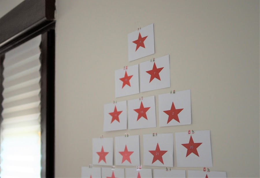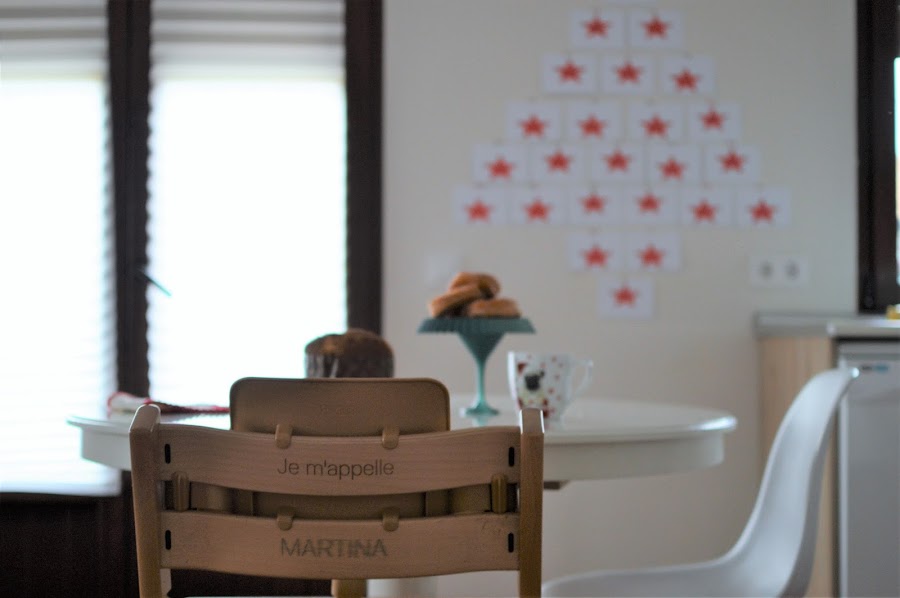 Y para terminar, o mejor dicho, empezar con buen pie la Navidad, no puede faltar un calendario de adviento, este año no tenia mucho tiempo, ni espacio, así que prepare unas tarjetas con los números y premios correspondientes y las coloqué formando un árbol en la pared de la cocina, con un poquito de washi tape.