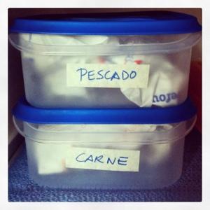 En esta bandeja también he dejado un hueco para comida ya cocinada, como pimientos asados o botes de caldo que preparo.