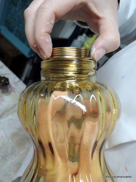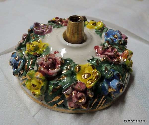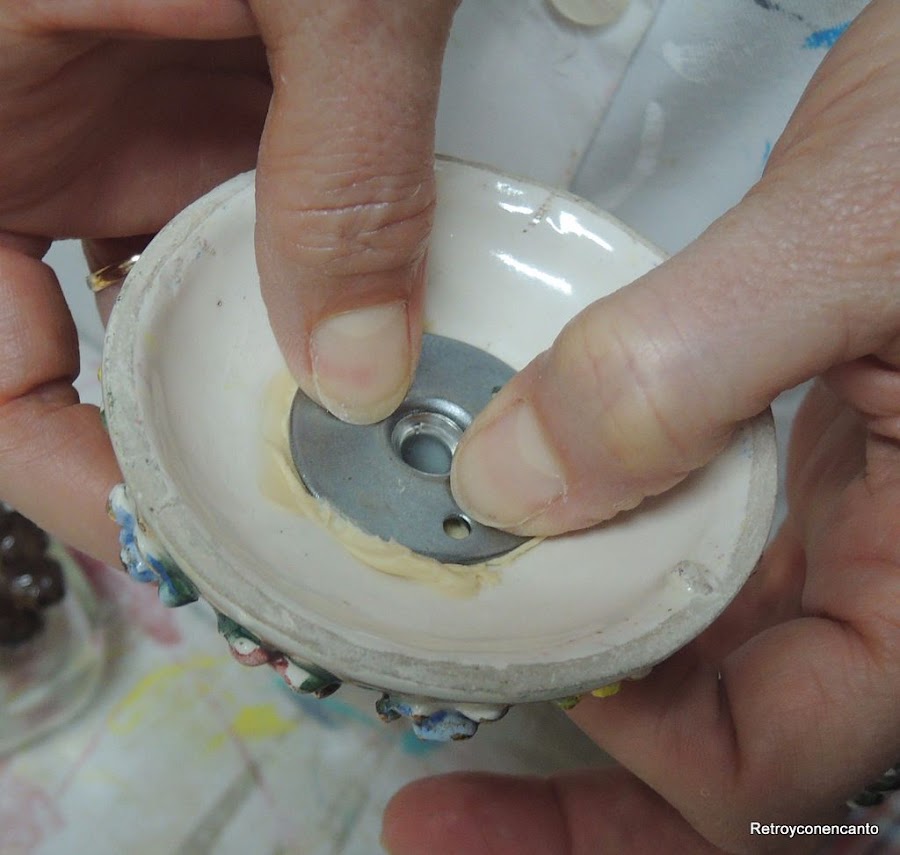 ... esta plaquita que pegamos por dentro con pegamento de contacto. Y todo esto para pasar por ahí el cable y que éste no tuviera holgura, de manera que el "platito" de cerámica no cayera sobre la tulipa y se mantuviera arriba para proteger visualmente la conexión al techo, y decorar de camino.