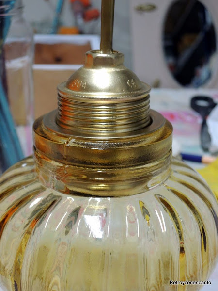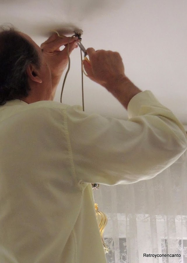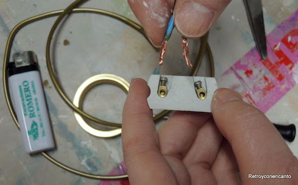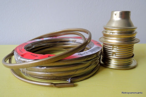 Fuimos a Leroy, que siempre nos saca de apuros, a ver cómo podíamos darle forma a aquello, y nos trajimos cable y un casquillo que se ajustaba a la perfección a la tulipa (¡vaya suerte!)