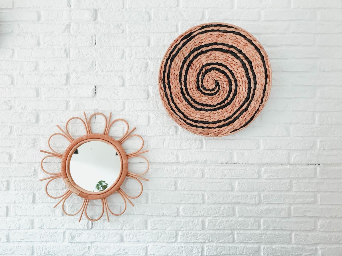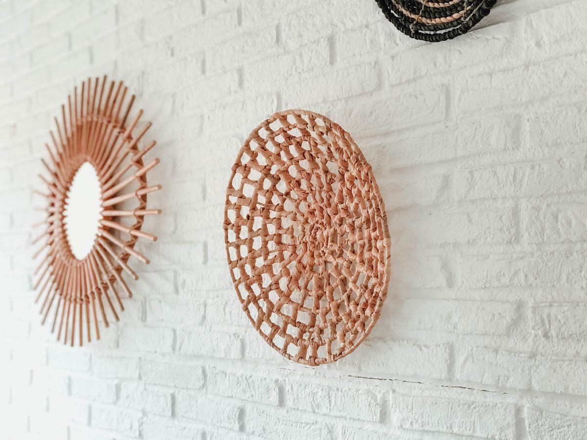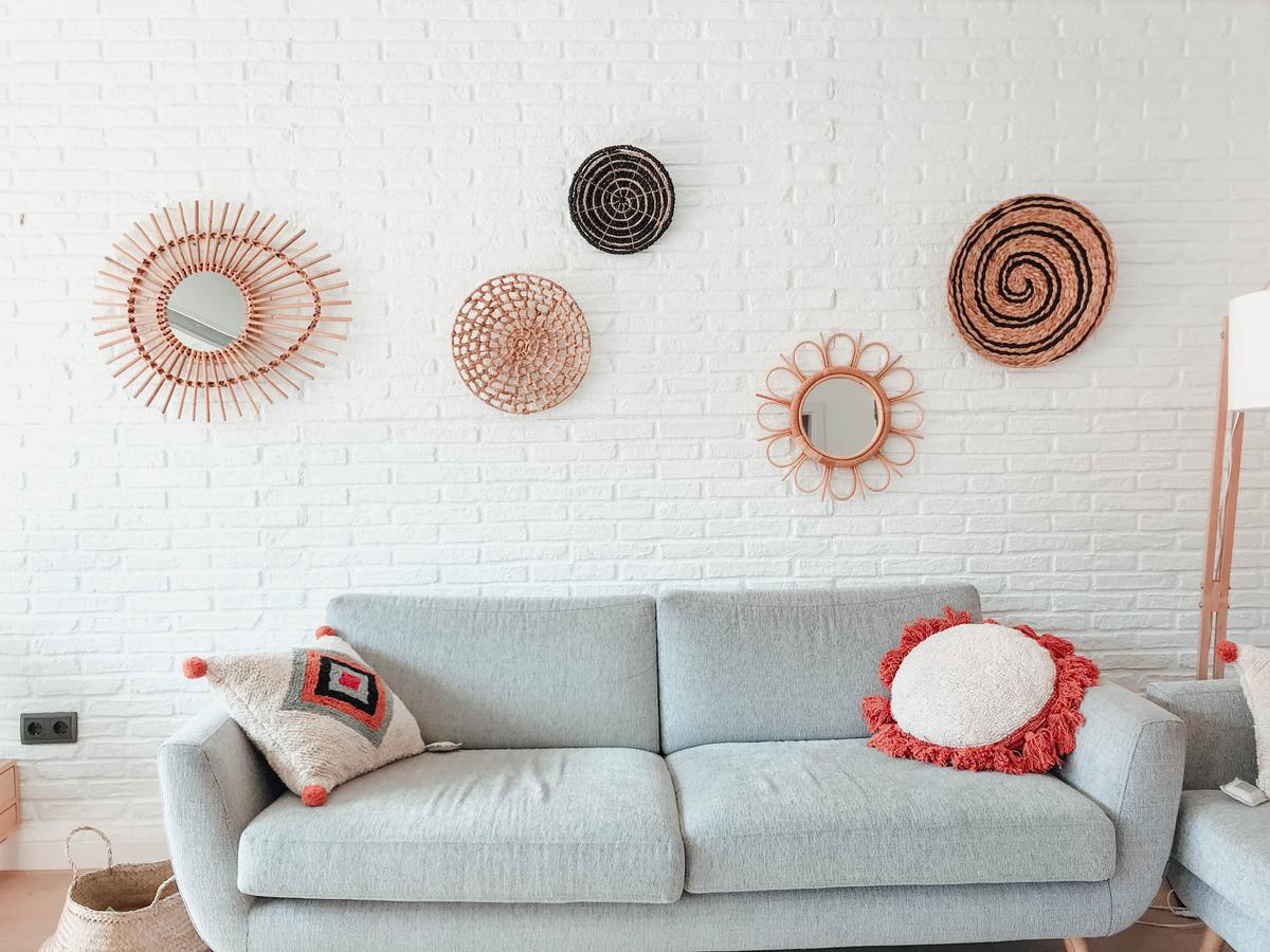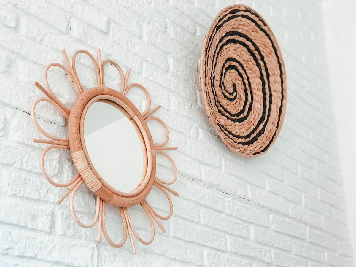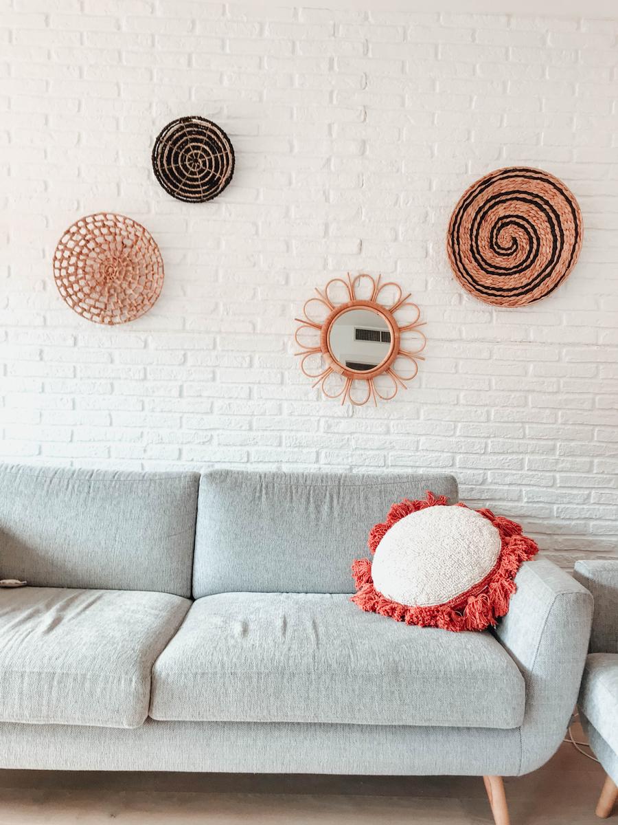 Espejos de bambú: ya sabéis que me chiflan, que son un TOP en el estilo boho y que quedan genial en cualquier espacio: comedores, pasillos, recibidores y por supuesto salones. En mi caso escogí dos: uno en forma de flor y otro un pelín más grande en forma de ojo. No pesan excesivamente con lo que con un simple clavo pudimos fijarlos en la pared.