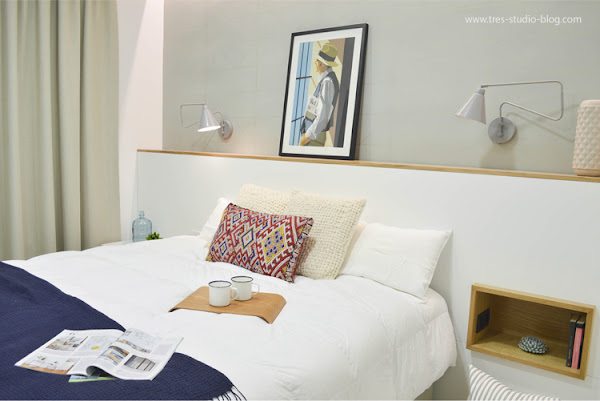 Diseñamos a medida tanto el cabecero como el armario para aprovechar al máximo el espacio y darle la funcionalidad necesaria que necesitaba el cliente. Pero al mismo tiempo, lo diseñamos de tal manera que conseguimos un juego asimétrico con las mesitas de noche y creamos una repisa muy útil en la parte superior sin recargar excesivamente la pared del cabecero.