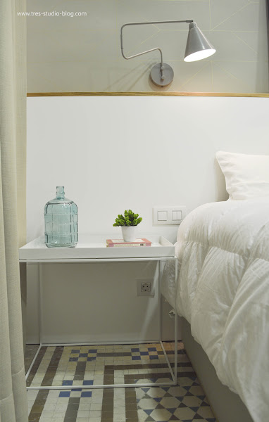 El papel pintado que elegimos para el cabecero, lo seleccionamos con motivos geométricos muy sutiles en líneas doradas, que se perciben con más fuerza cuando la luz incide en el papel.