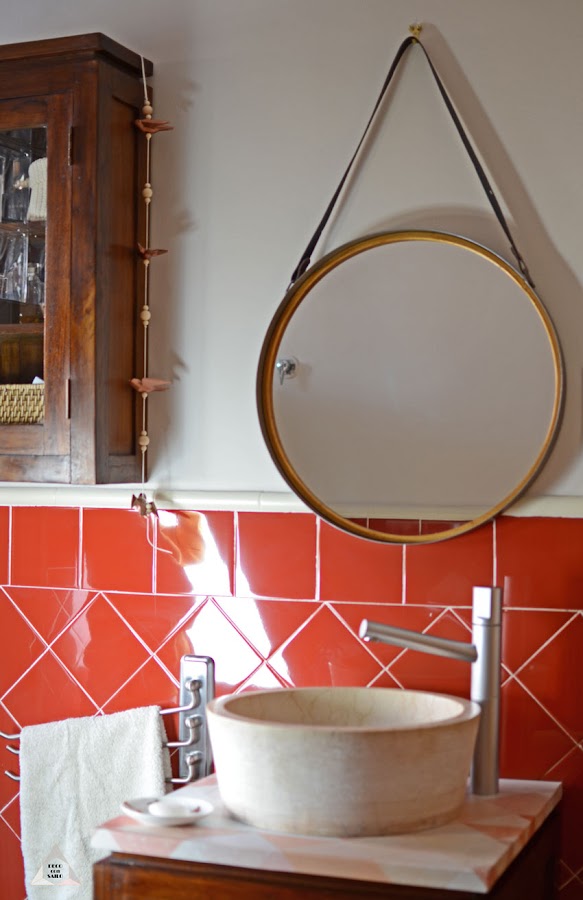 En las paredes, cuando hice la reforma de este baño, elegí el rojo. Fue muy atrevido, aunque el resultado me encantó y me sigue gustando muchísimo, pero quería cambiar el color de la pintura de las paredes por uno más claro, y dejar así el rojo solo en los azulejos. He elegido un color hueso muy clarito, que aporta mucha luminosidad al baño, además va perfecto con los azulejos que se alternan con los rojos.