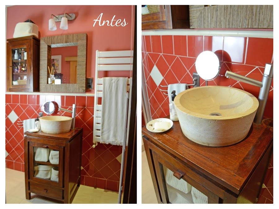 Abajo os dejo fotos del "antes" para que veáis el cambio. En cuanto a la deco, hemos comprado un nuevo espejo, porque el que teníamos era demasiado grande y oscuro y visualmente hacía mucho más pequeño el baño. No sé si os gusta el cambio, pero yo estoy encantada, además la reforma la hemos hecho en un par de días y lo que es mejor ¡sin obras!.