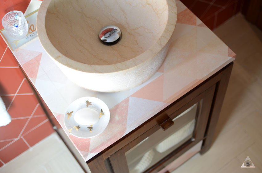 La instalación del vinilo es superfácil, lo más complicado fue desmontar el lavabo y el grifo, pero lo hicimos con cuidado y no nos supuso ningún problema. Para instalar el vinilo en el mueble, os recomiendo este vídeo de la marca, donde se ve perfectamente cómo acabar las esquinas de forma muy sencilla, que es lo que te puede plantear alguna duda.