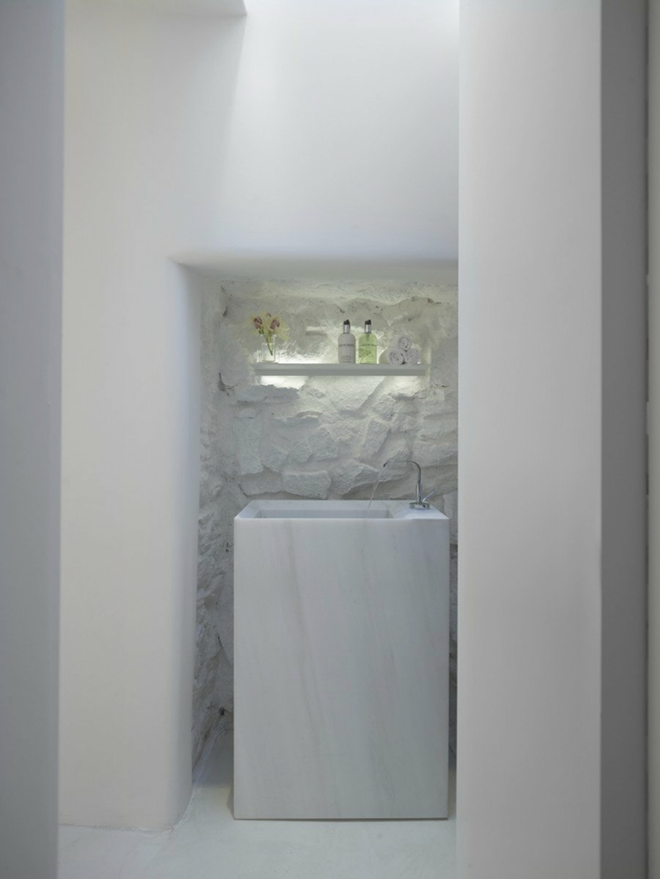 La espectacularidad de una pieza en mármol blanco y líneas puras como lavabo, la sencillez de su grifería, la sutileza de la luz indirecta, la blancura de cada rincón, la perfección de los detalles, el mínimo toque floral y la poderosa pared de canto blanco. Quiero este baño para mi, sin dudarlo. Imaginemos la sensación que cualquier invitado que viniera a casa se llevaría si al entrar al baño lo recibiera este rincón. Sin palabras.