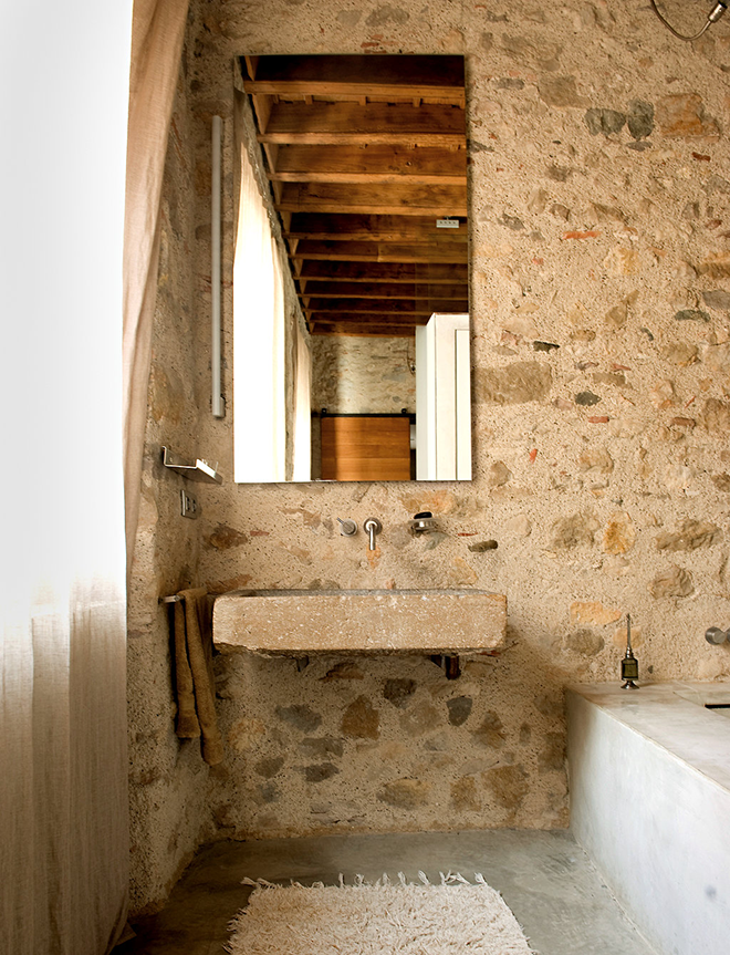 Un baño envuelto en historia, en piedra y materiales actuales a su vez como el microcemento. Un espacio que invita al descanso, tranquilidad y calma. Un lugar en el que tomar una ducha se convierte en un gigantesco placer.