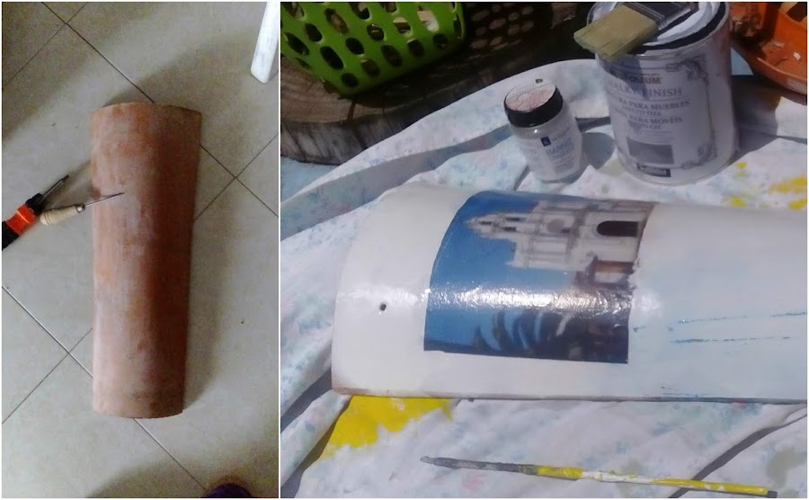 El proceso ha sido fácil pero un poco largo, laborioso. A la teja le abrí dos agujeros para poder pasar luego la cuerda para colgarla, le di una mano de pintura a la tiza blanca en spray, le puse craquelador a trozos por toda la superficie, y finalmente la pinté con gris antracita, también chalk paint.