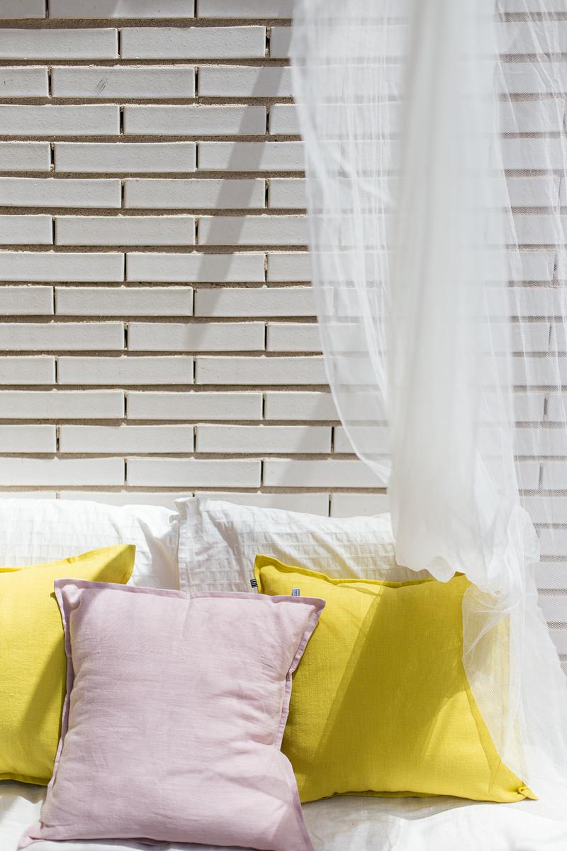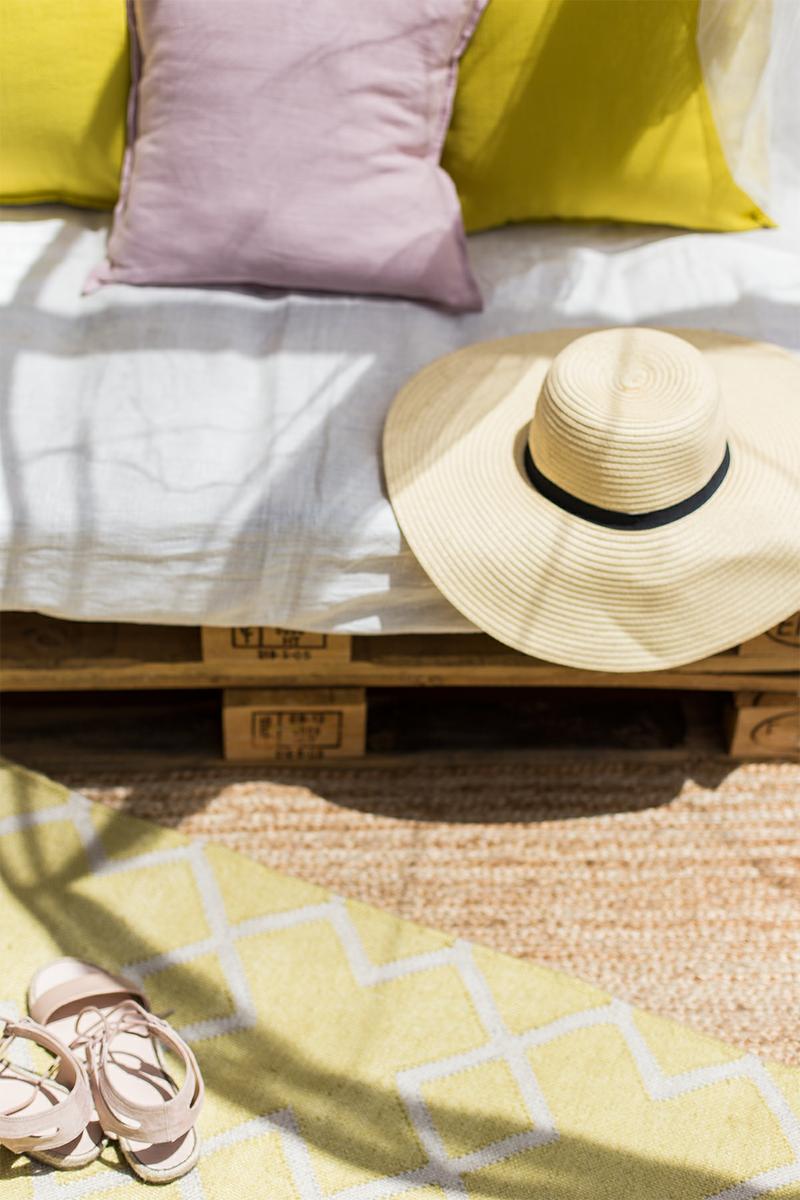 No pudimos trasladar mobiliario pero sí que podíamos crear un estilismo para, por lo menos, despertar la imaginación sobre lo que allí se puede hacer. Con las pocas cosas que teníamos y con su sillón de palets, creamos un pequeño rincón de relax cómodo y sobre todo, refrescante.