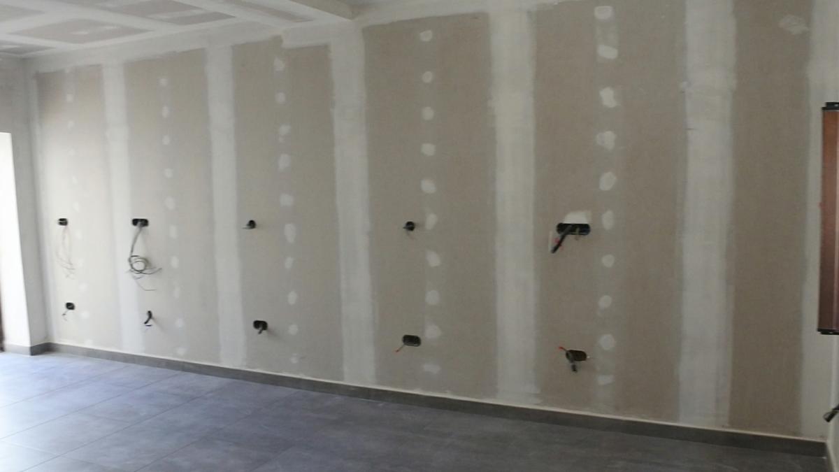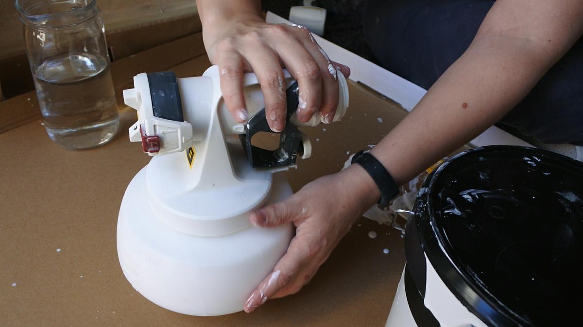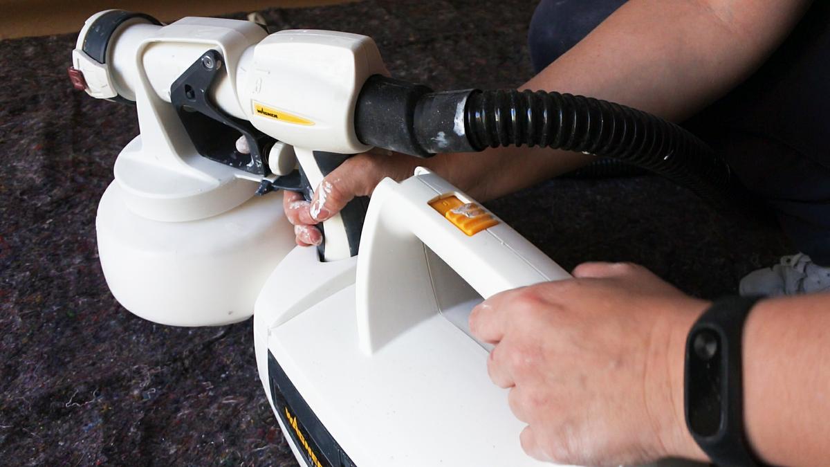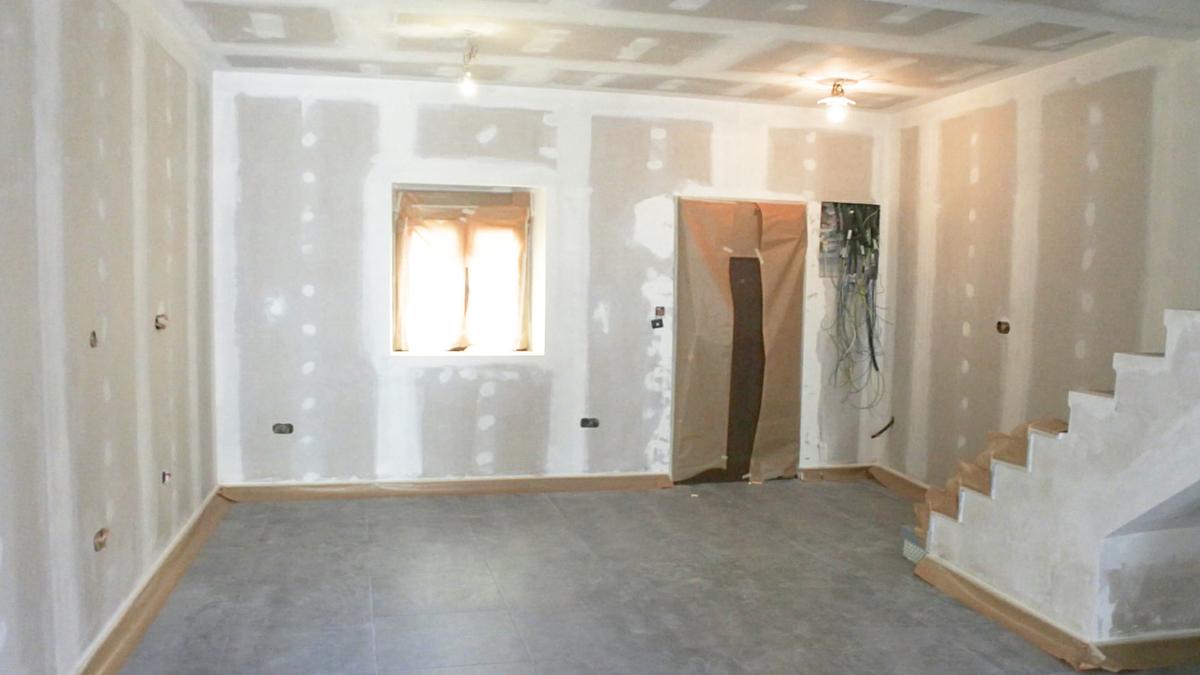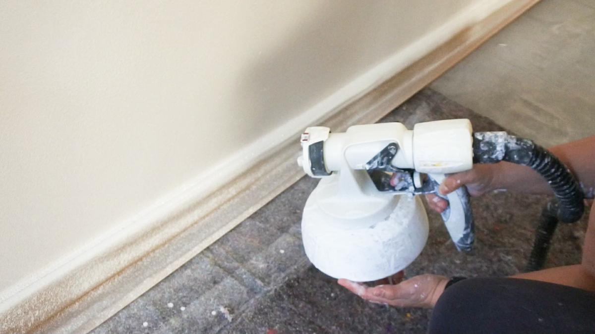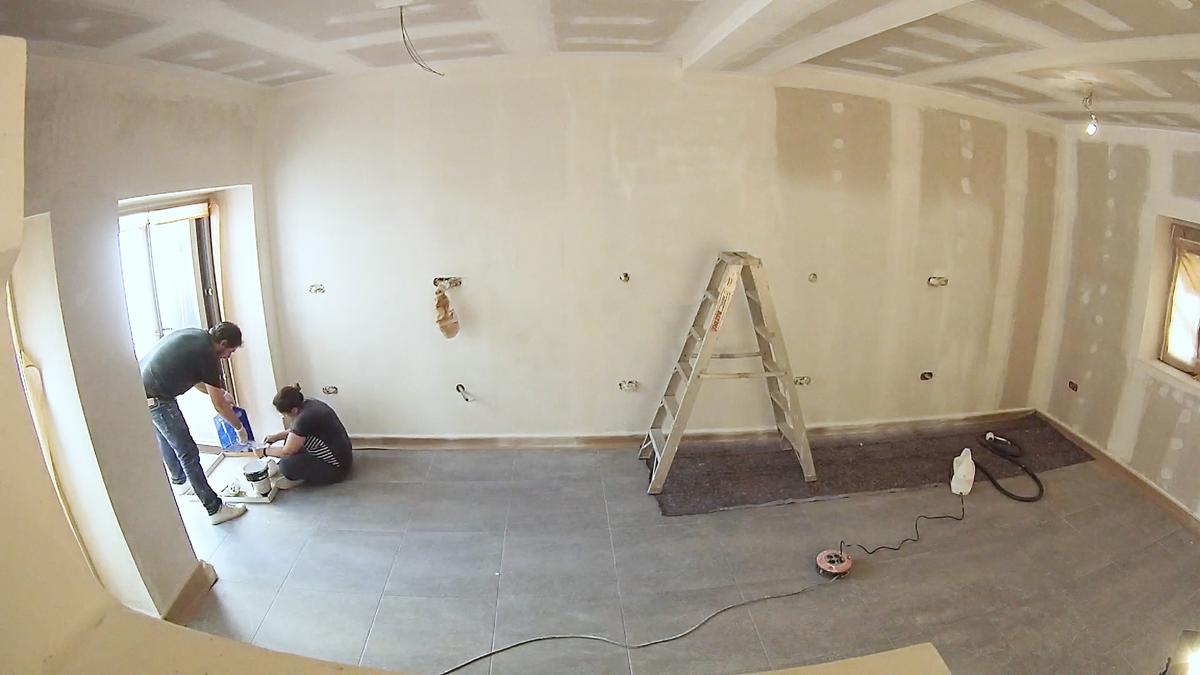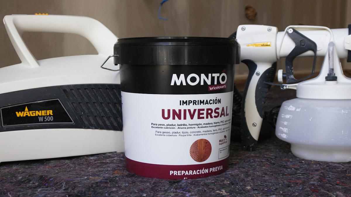 Una vez todo protegido y preparado, comenzamos a prepararlo todo para pintar. En nuestro caso, como teníamos las paredes únicamente con pladur, aplicamos primero una capa de imprimación universal para preparar de este modo la pared y conseguir así que la capa posterior de pintura agarre mejor y quede perfecta.Para aplicarla decidimos hacerlo con nuestra pistola Wagner. Si nos seguís en redes sabréis que después comenzó a fallar y no nos permitió terminar todo el salón con ella, pero sí que nos ayudó en gran parte.