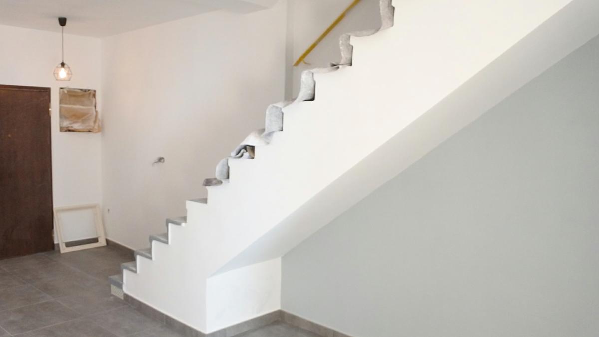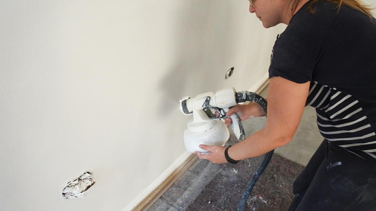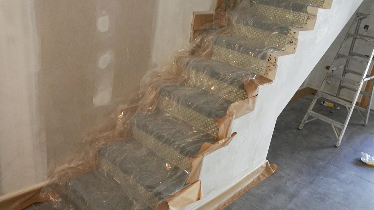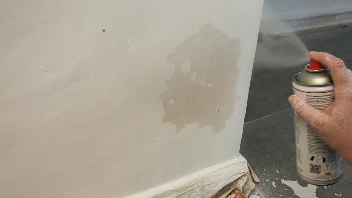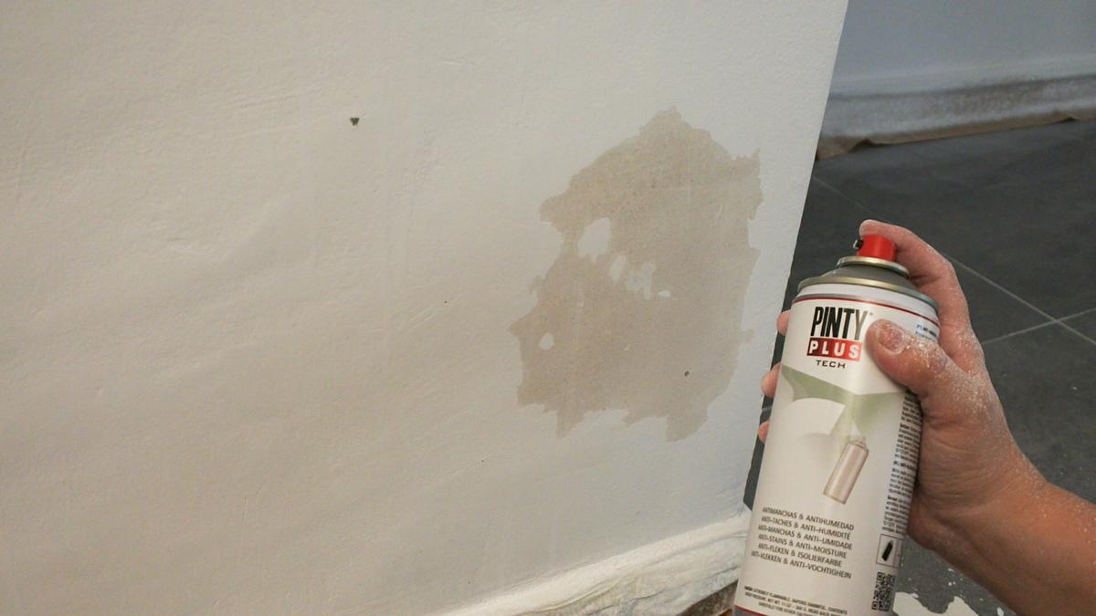 Antes de comenzar a pintar aplicamos pintura antihumedad en el bajo de la escalara ya que es una zona en la que suele aparecer. Lo hicimos con la pintura en spray antihumedad de Pintyplus. Es blanca y se aplica de manera muy cómoda además es de secado rápido.Comenzamos con la pintura