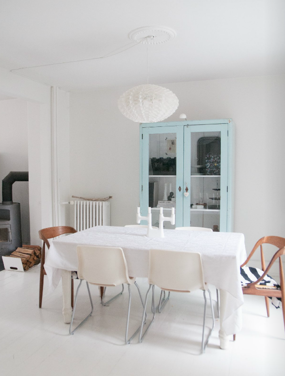 Un buen ejemplo es el comedor, en el que a la lámpara de Normann Copenhagen la acompañan unas sillas de Ikea y una preciosa alacena vintage pintada en azul celeste.