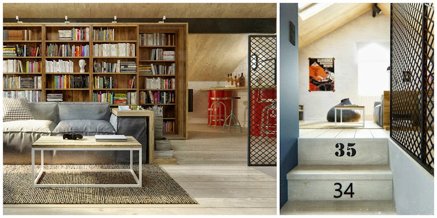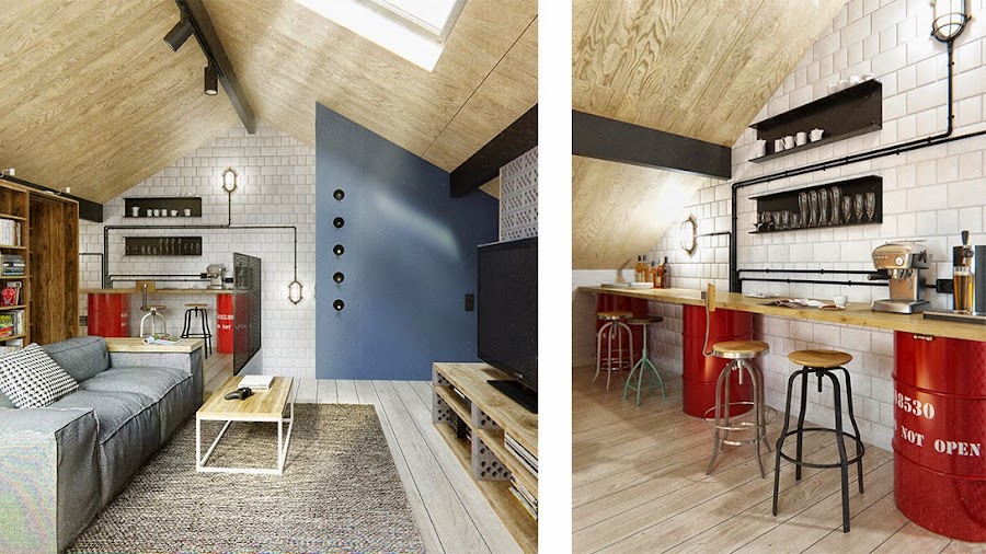 Toda la buhardilla tiene una decoración joven y moderna que consiguen con detalles como el de las escaleras numeradas (fácil de hacer en nuestras casas con una plantilla y un poco de pintura), los barriles en rojo que sujetan la barra la cocina o el cableado a la vista sobre el archi-famoso azulejo blanco.