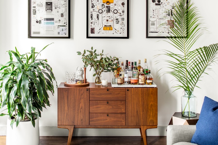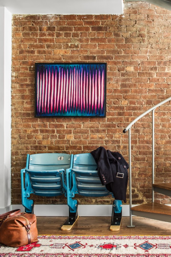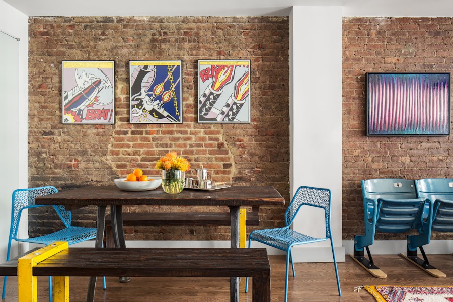 En este apartamento que visitamos hoy, además de sus preciosos ventanales, lo que también nos llama la atención nada mas entrar es su estupenda pared de ladrillo visto. Con ese ladrillo tan desgastado por el paso del tiempo y con ese toque vintage de la zona "reparada " de la pared del comedor, que te invita a imaginar alguna que otra historia detrás de eso. Y en cuanto a toques vintage también podemos destacar otros, como los asientos de estadio (que también tendrán su buena historia detrás) o el aparador estilo art nouveau.