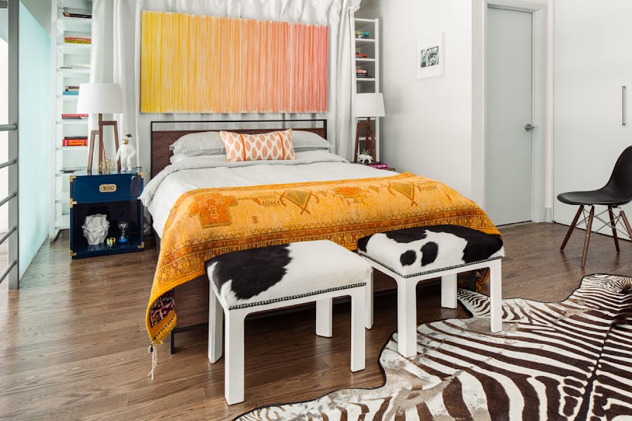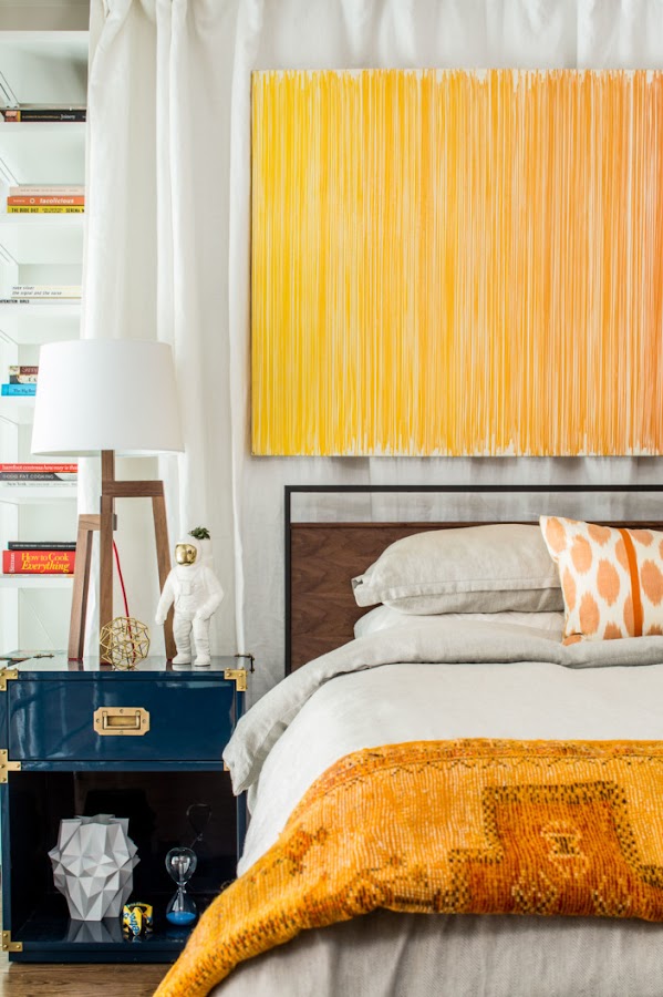 Pero sin duda lo que destaca de esta decoración son su pinceladas de color, y digo pinceladas porque el color esta muy presente pero no de forma excesiva gracias a la técnica del 60-30-10. En este caso han sabido aplicar muy bien esta conocidísima técnica para poder introducir el color en la decoración y que no acabe siendo algo que canse. Porque ese el principal problema a la hora de introducir colores muy intensos, que nos podemos cansar muy rápidamente de ellos. Estos colores podemos verlos en detalles como las sillas del comedor, los cuadros o los textiles del dormitorio por ejemplo. El color, siempre que es introducido de forma correcta, es un gran recurso para darle personalidad y alegría a nuestras decoraciones.