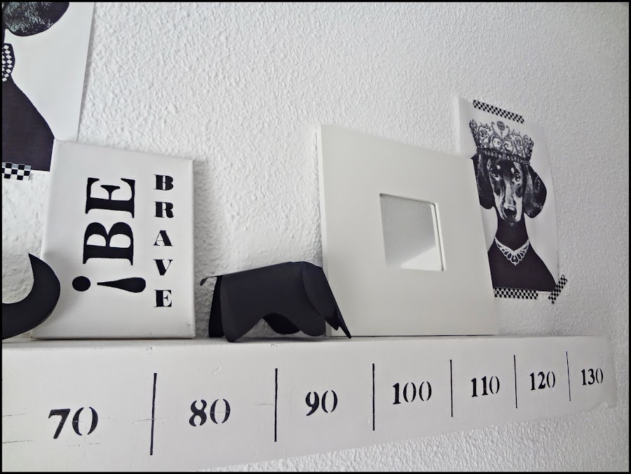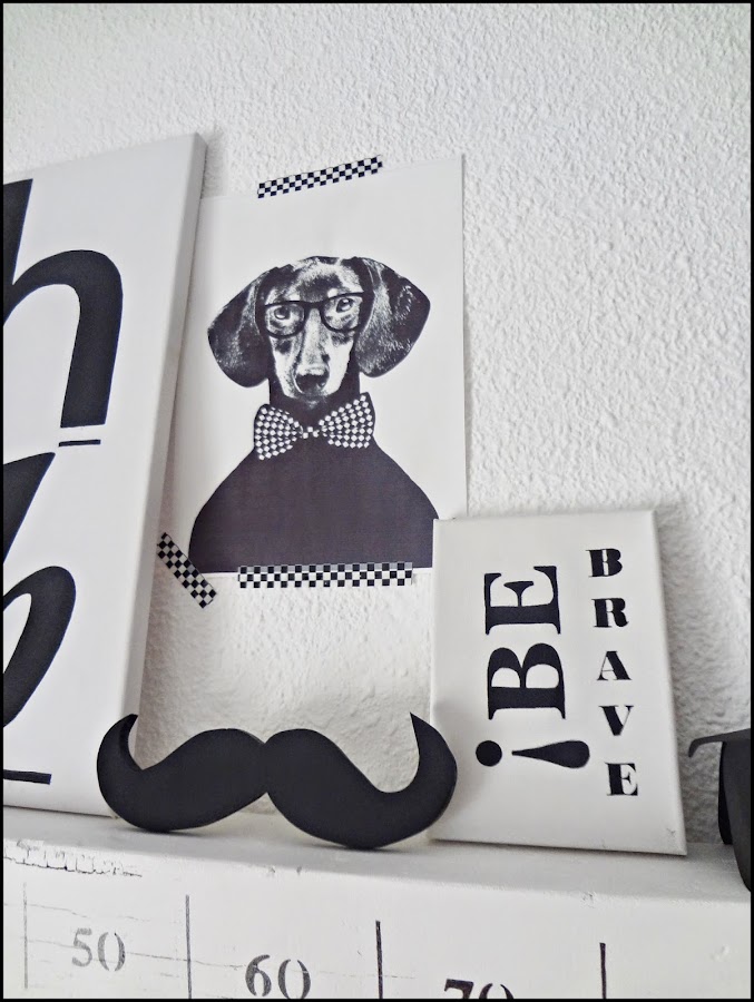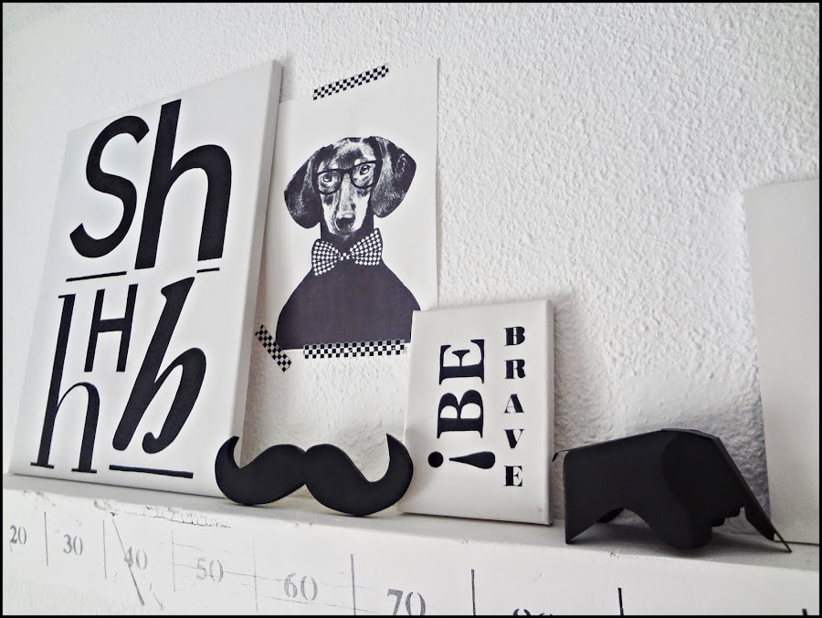 Por último también he puesto uno de los Elefantes Eames de cartulina que enseñé hace unas semanas, y la silueta de madera con forma de bigote que hice hace ya un tiempo también.