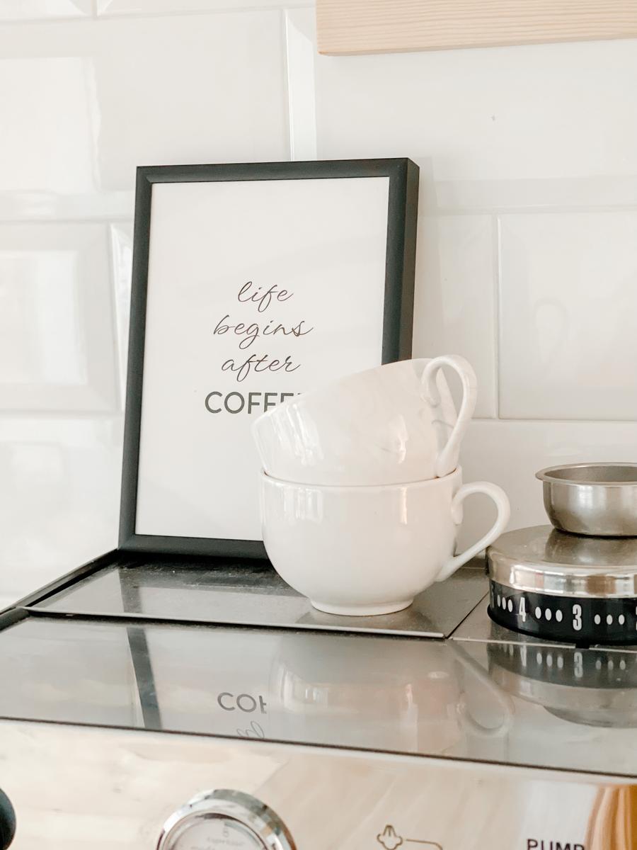 Una pequeña lámina al lado de la máquina de café, apoyada de la pared junto a las tazas para preparar el desayuno cada mañana con el texto: life begins after coffee.