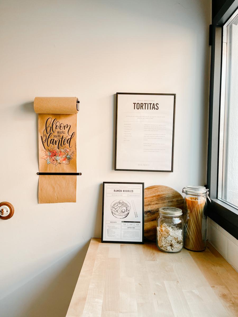Como os comentaba, la cocina puede ser una estancia perfecta para decorar con pequeñas láminas que hagan referencia a los momentos que se viven aquí: junto al café, la comida preferida, rincones especiales… Os muestro como hemos decorado nuestra cocina abierta en el apartamento del pueblo: