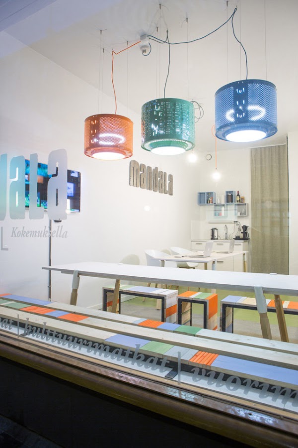 Estas lámparas hechas con tambores de lavadora las podemos encontrar en el diseño interior de una oficina para Mandala, una agencia de viajes y operador turístico con sede en Helsinki.
