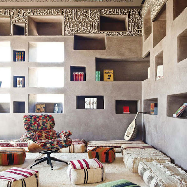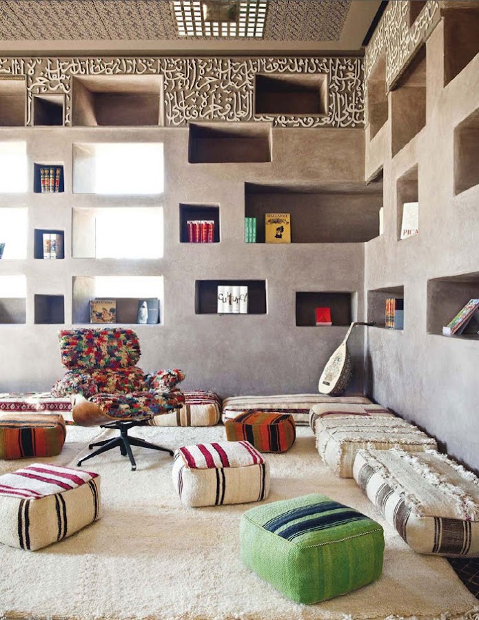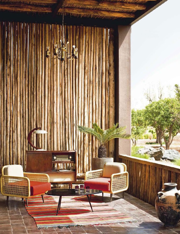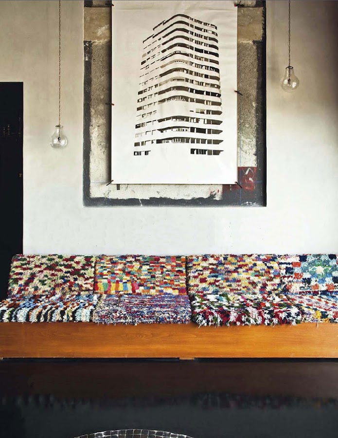 Hoy en Marruecos cerca de las montañas del Atlas ,el hotel Fellah es una mezcla de muebles vintage con la tradición marroquí y el kilim y las alfombras bereberes como grandes protagonistas en pufs , taburetes y sillones , y lo mas..... la butaca Eames tapizada ......que maravilla!