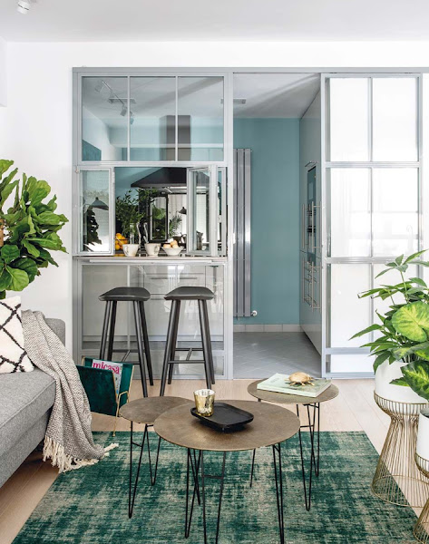 Se ha creado una gran estancia principal, con el salón, comedor y cocina. El salón y el comedor se dividió con un mueble bajo. Y por su parte la cocina se independizó del salón a través de un cerramiento de acero lacado en gris y vidrio.“La idea era ganar luz y sensación de espacialidad en la cocina, pero sin integrarla completamente en el salón”, explican desde el estudio GH&AA, autores de la reforma “Y lo conseguimos con la carpintería. Además, como una de las hojas es corredera, permite unir o separar las estancias según se desee”.