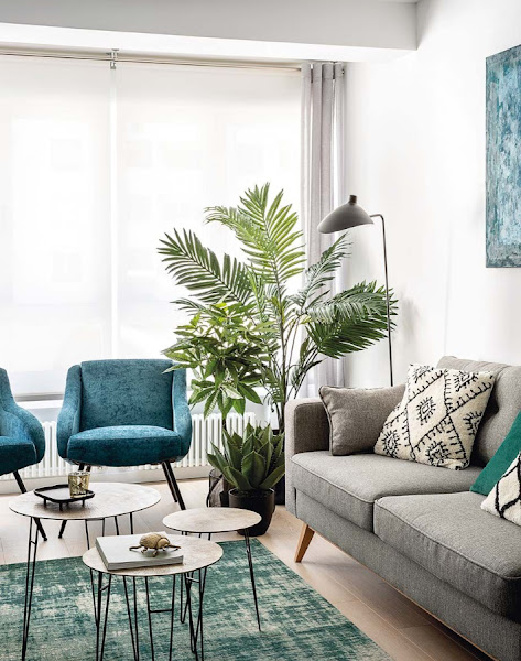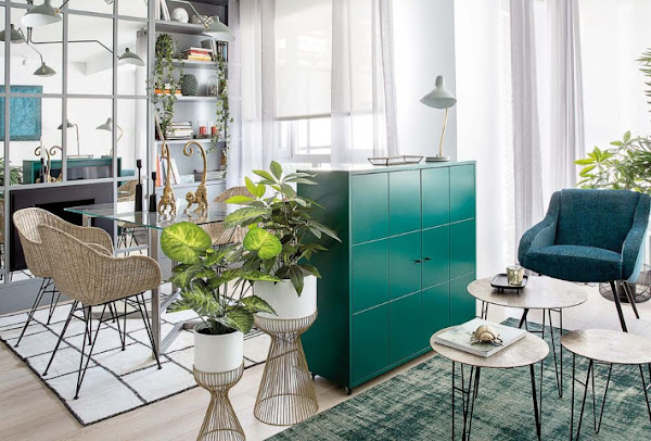 Sobre el lienzo blanco destacan muebles, textiles y complementos en un intenso verde agua, el color que protagonista de la decoración del salón.