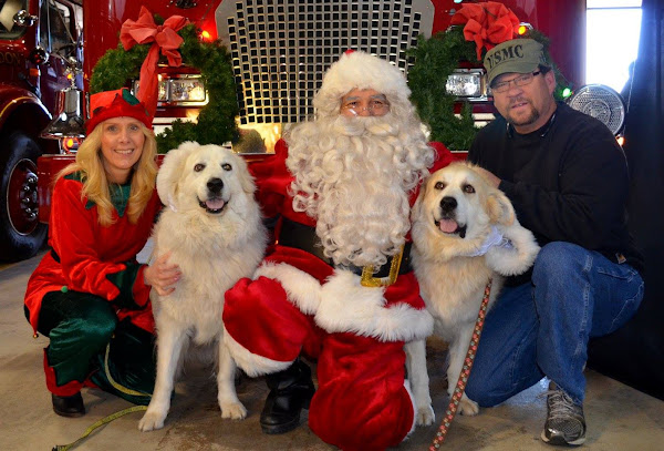 El Departamento de Bomberos no podía dejar sin tomar una selfie de Santa con uno de los Elfos y las mascotas, 2 bellos perros que corren a la par de la motobomba.