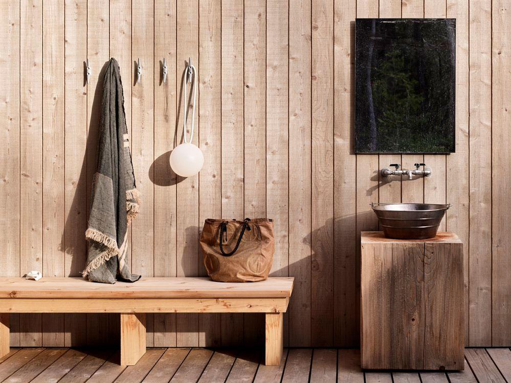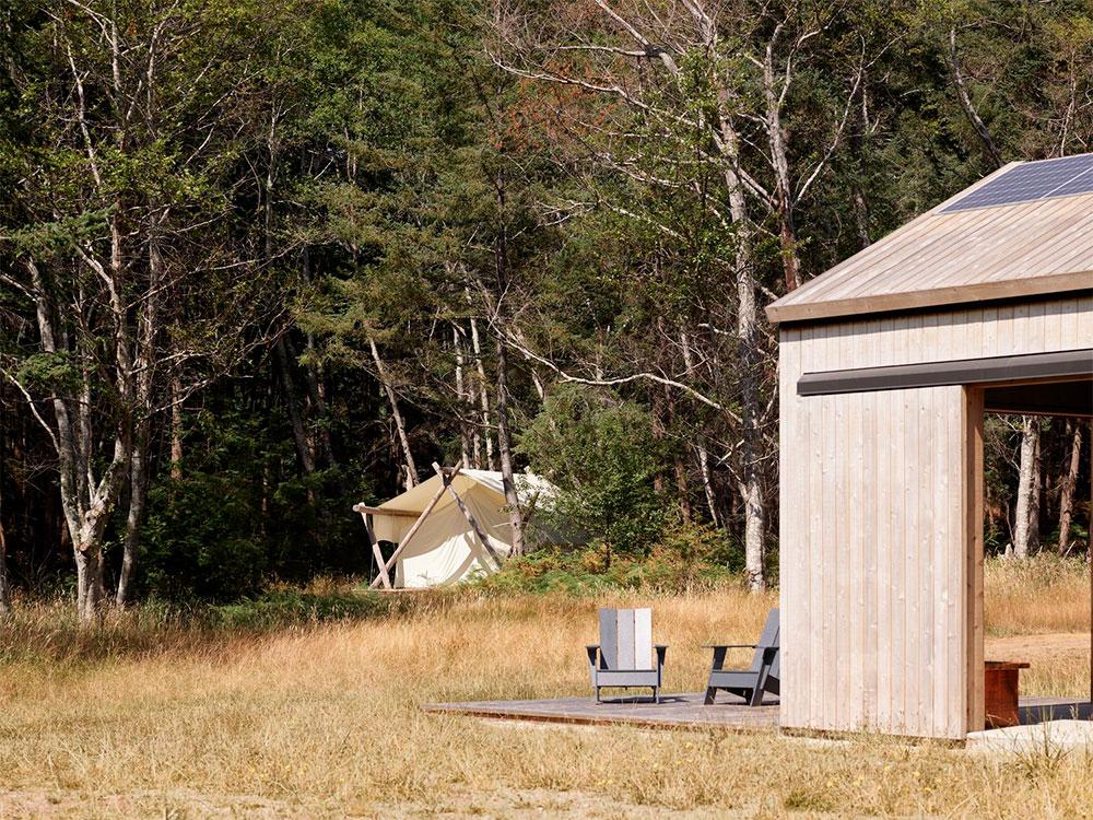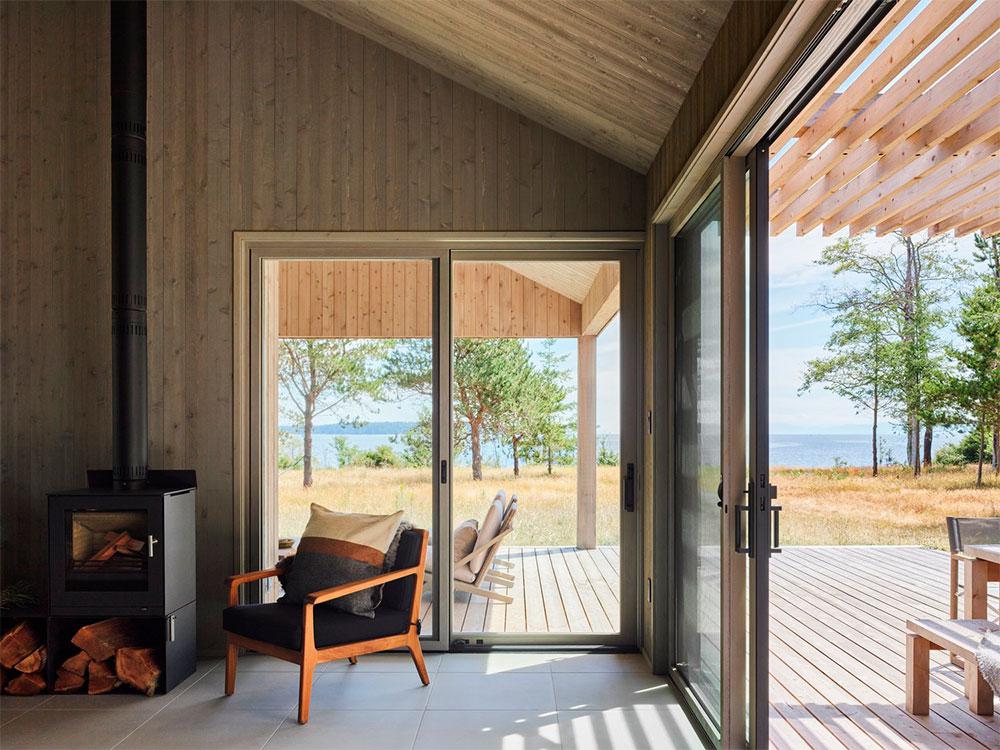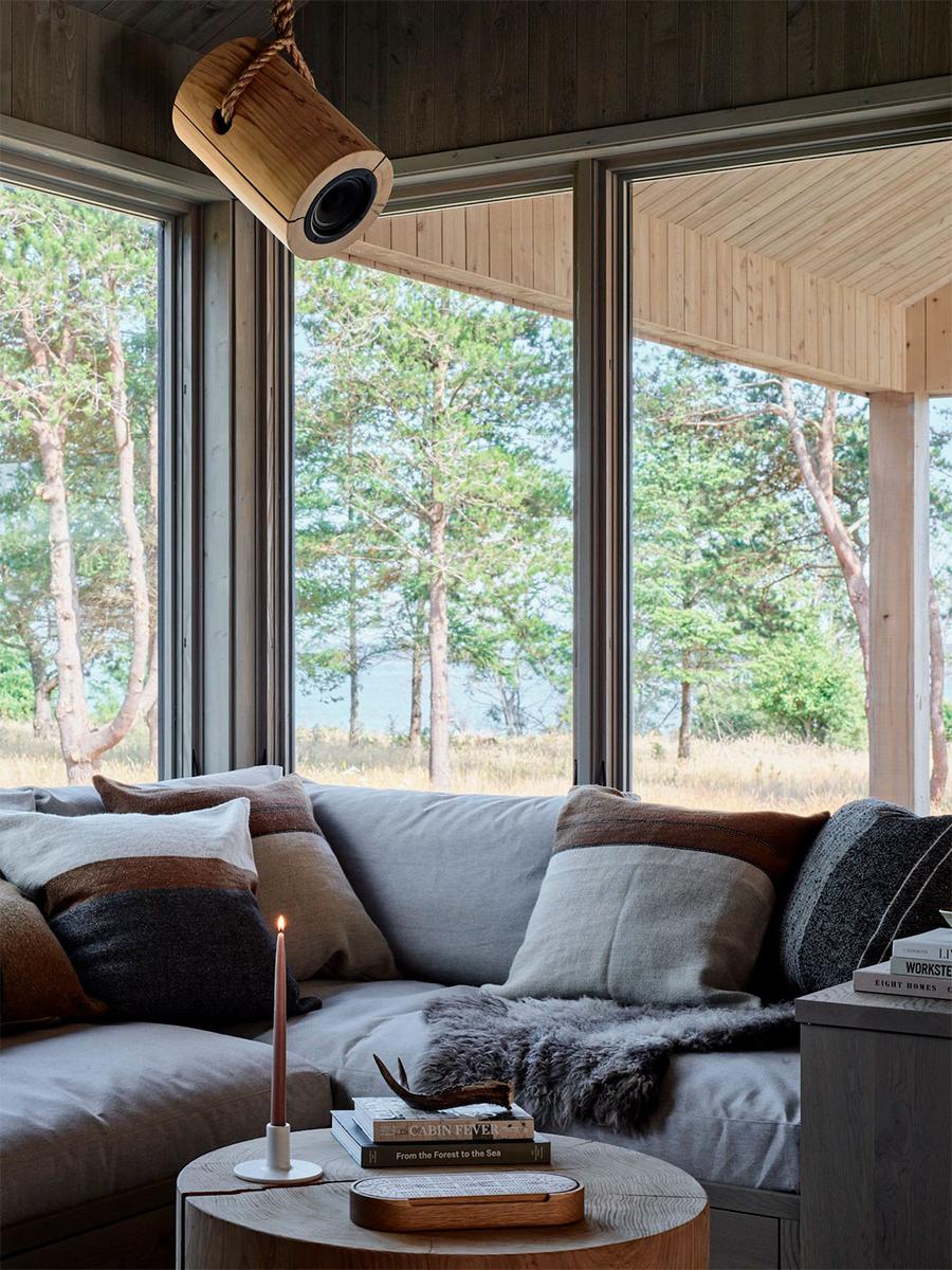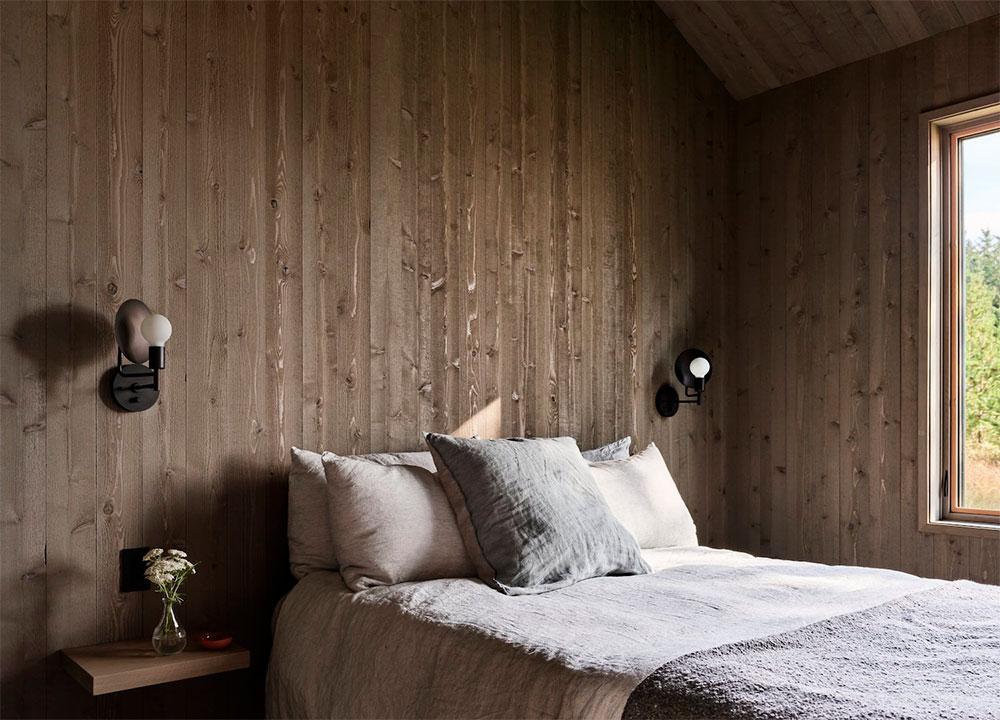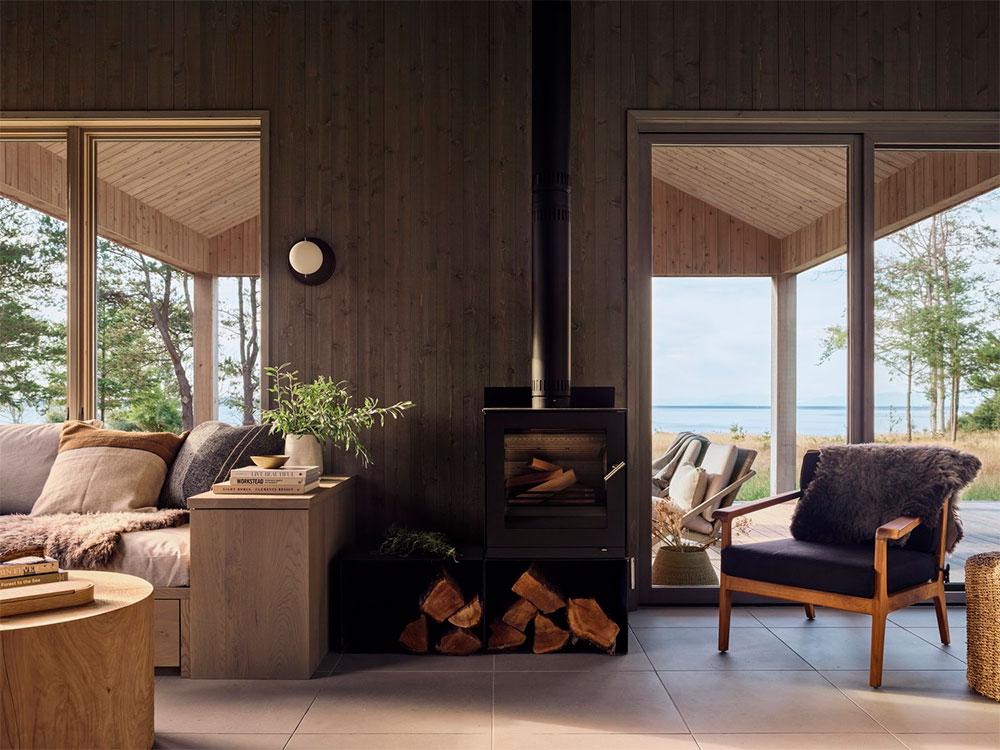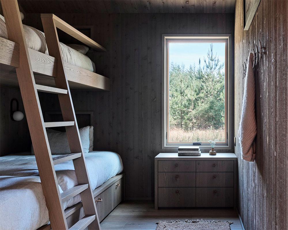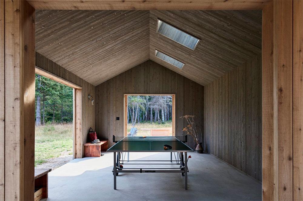 Tanto los techos como las paredes de ambos edificios están revestidos con tablas de cedro. En su parte interior, estas tablas se tiñeron de un tono más grisáceo para apaciguar el sol directo que entra por los ventanales. Esto, junto a un mobiliario cálido y rustico, evoca la sensación de vivir en una granja. Una paleta inspirada en un entorno que, en su día, fue un prado para ganado.