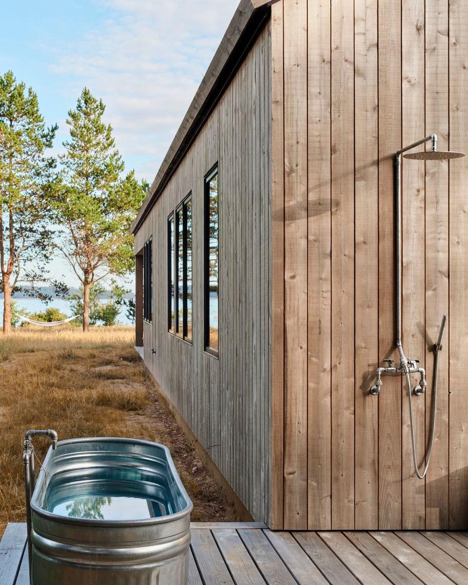 El proyecto se estructuró en forma de L. Por un lado, se encuentra la casa cuyas habitaciones, todas, tienen salida al exterior. Y por otra, un módulo tipo granero que se usa como espacio multiusos. Incluso podemos encontrar una zona de baño y ducha al aire libre, nada como esto para sentir la comunión con la naturaleza.