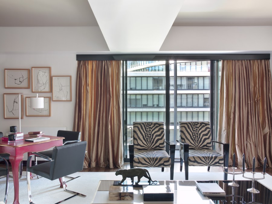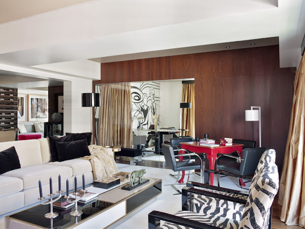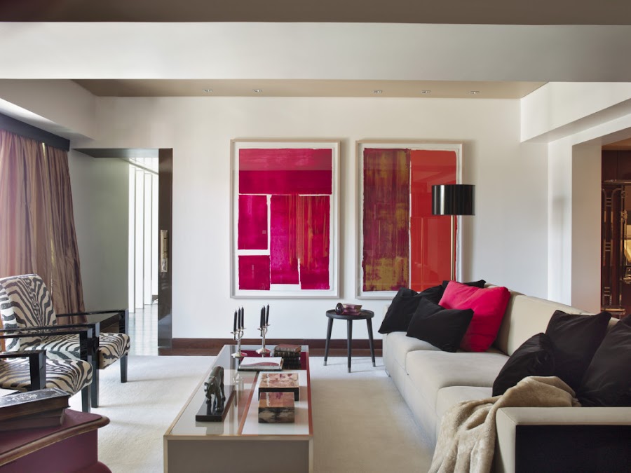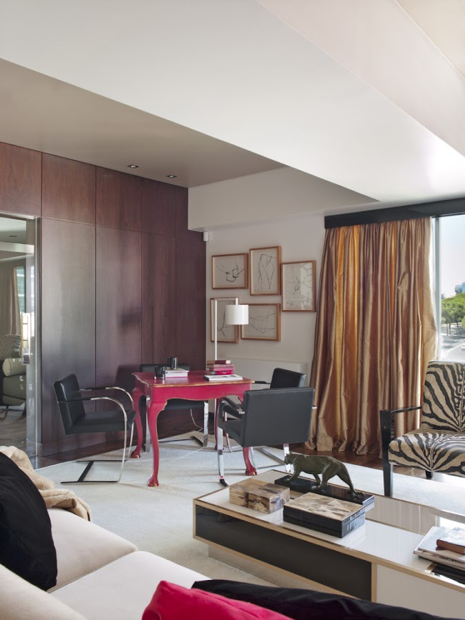 En la decoración del salón destacan los golpes de color que proporcionan la mesa de juego y los cuadros en tonos rojizos. La tapicería animal print de las butacas es un complemento perfecto para el tapizado neutro del sofá.