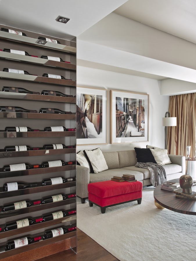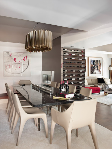 En el comedor llama la atención la vinoteca que nos enconatramos en la pared, pero no debemos d eperder de vista la elegante mesa de comedor con tapa de marmol.