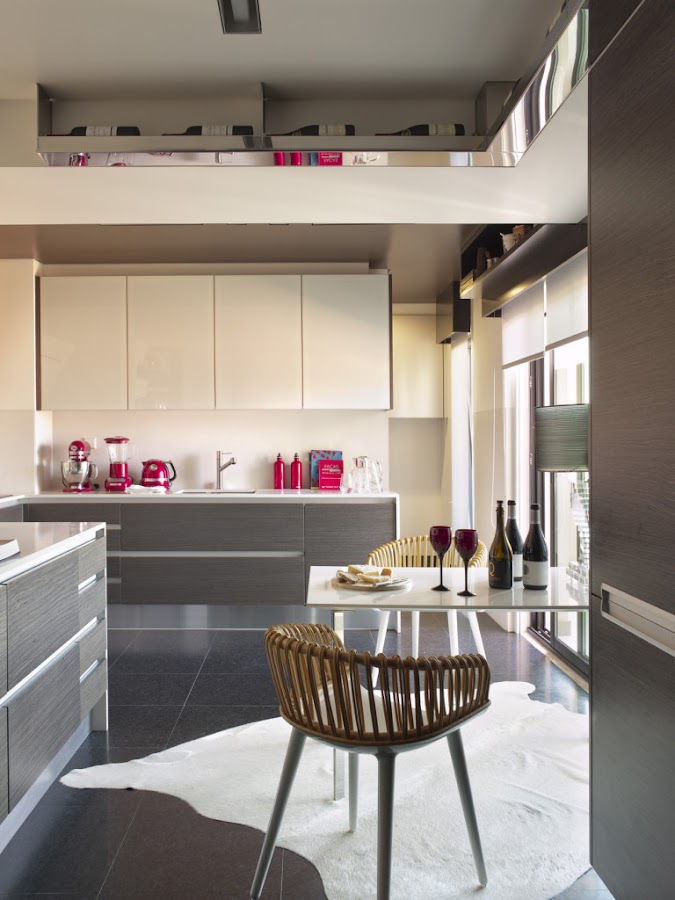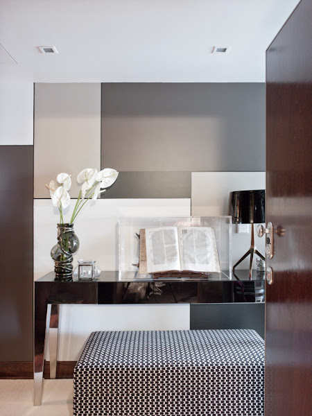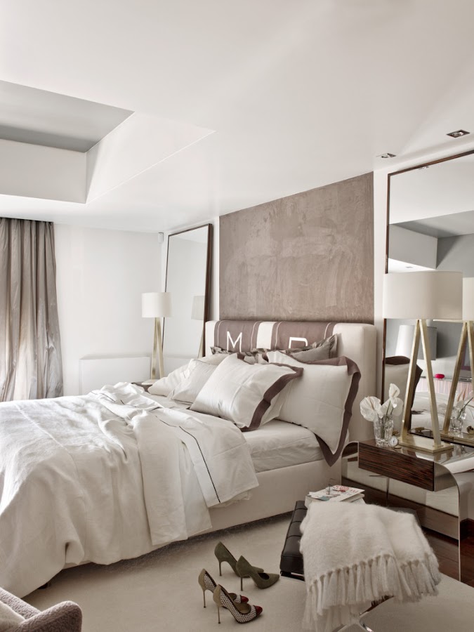 La zona del dormitorio esta decorara en tonos neutros, que confieren una atmosfera de serenidad al espacio. Nos gusta la idea de colocar grandes espejos sobre las mesillas, para aumentar la sensación de amplitud de la estancia.