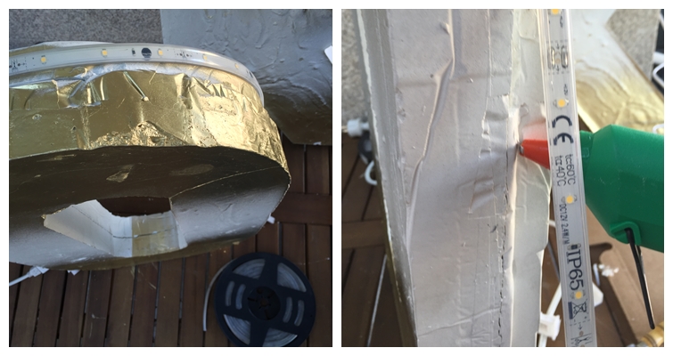 POR ÚLTIMO PEGUÉ LA TIRA DE LEDS. y AUNQUE AL PRINCIPIO LO INTENTÉ CON SILICONA, FINALMENTE DECIDÍ QUE ERA MÁS SEGURO (POR EL CALOR) UN PEGAMENTO FUERTE. lAS DEJÉ SECAR Y LISTAS!