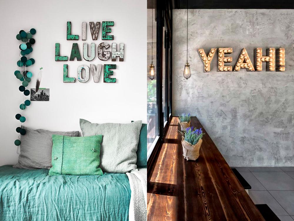 Las letras de madera envejecida se han convertido en imprescindibles en todo tipo de ambientes, tanto en viviendas particulares como en restaurantes y otros espacios públicos. Pueden ser luminosas, o sencillamente pintadas en un color envejecido, lo que le da ese aire tan romántico y encantador. Las letras de acero con efecto óxido aportan un aire industrial a los espacios, creando una atmósfera de estilo loft urbano, muy cosmopolita y juvenil.