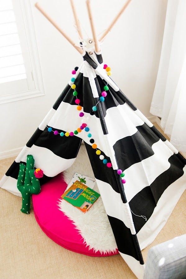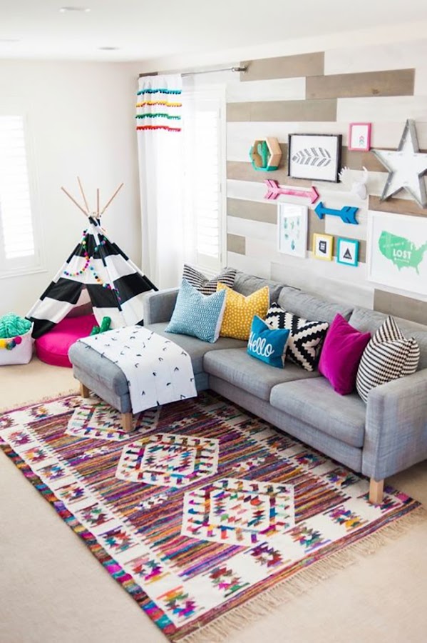 No es solo un gran ejemplo en lo que a combinar colores se refiere, además tiene la particularidad de tener una zona de juego para niños integrada y una composición de elementos muy particular, estrellas, cuadros, láminas... todo tiene cabida en este salón tan especial.