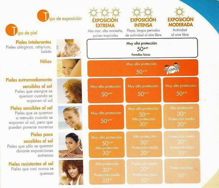 Importante sobre todo darse una buena protección, y aún más en las primeras exposiciones al sol, aplicar un factor solar alto. Una vez estemos bronceados podemos bajar el factor de filtro ¡pero nunca tomar el sol sin crema protectora! El número de factor siempre dependerá del tono de piel de cada persona. Más abajo os dejo un cuadro con los tipos de piel y exposición para que sepáis qué protección deberéis aplicar.